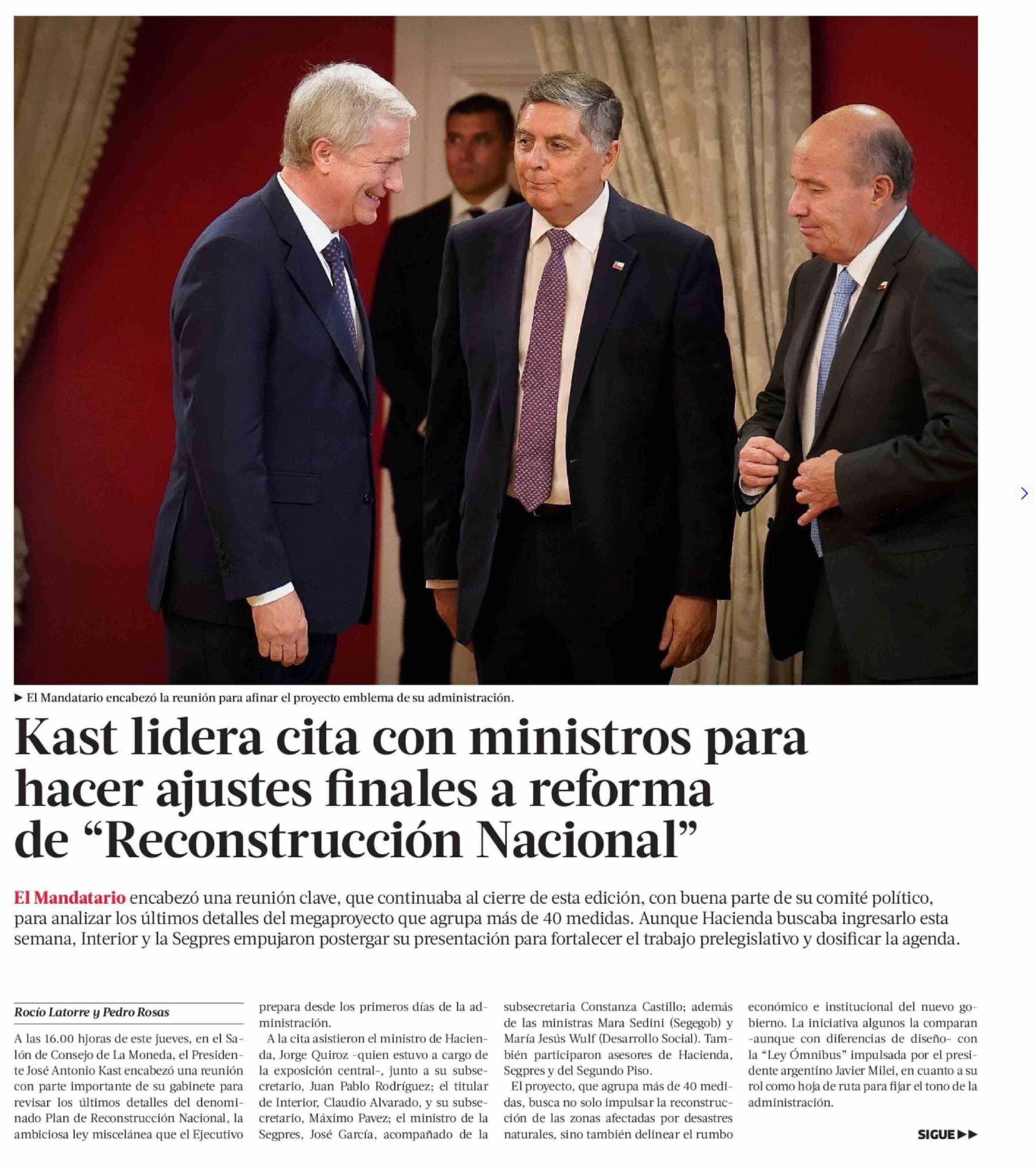 Kast lidera cita con ministros para hacer ajustes finales a reforma de "Reconstrucción Nacional" 10-04-2026 La Tercera |