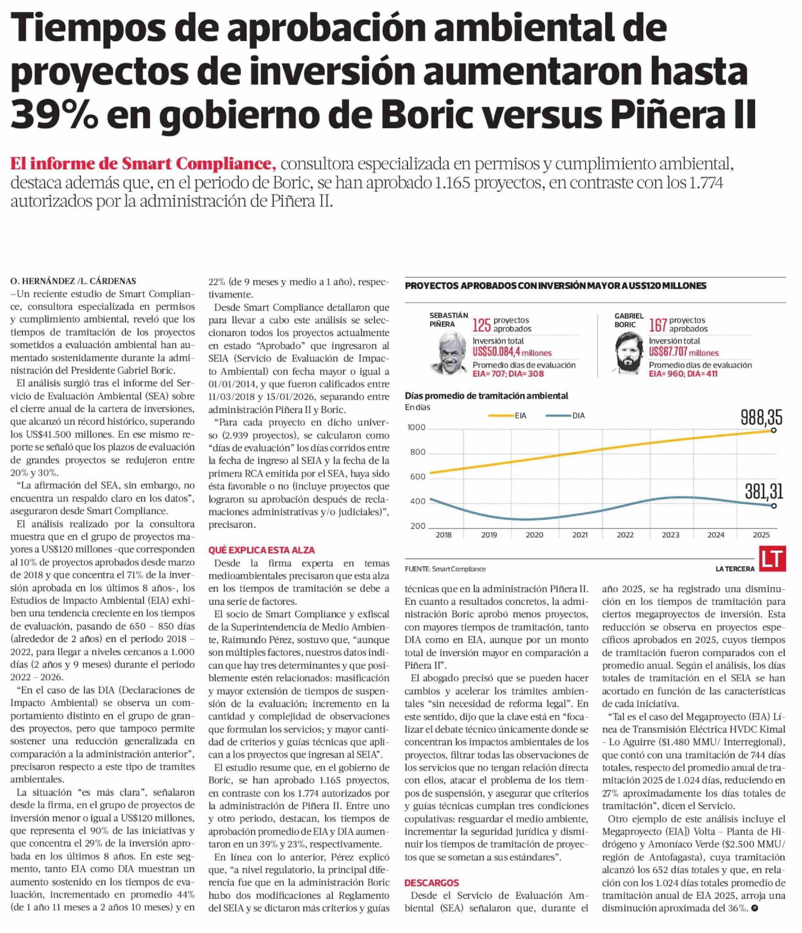 Tiempos de aprobación ambiental de proyectos de inversión aumentaron hasta 39% en gobierno de Boric versus Piñera II 06-02-2026 La Tercera |
