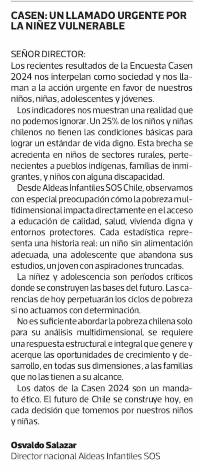 CASEN: UN LLAMADO URGENTE POR LA NIÑEZ VULNERABLE 16-01-2026 La Tercera |