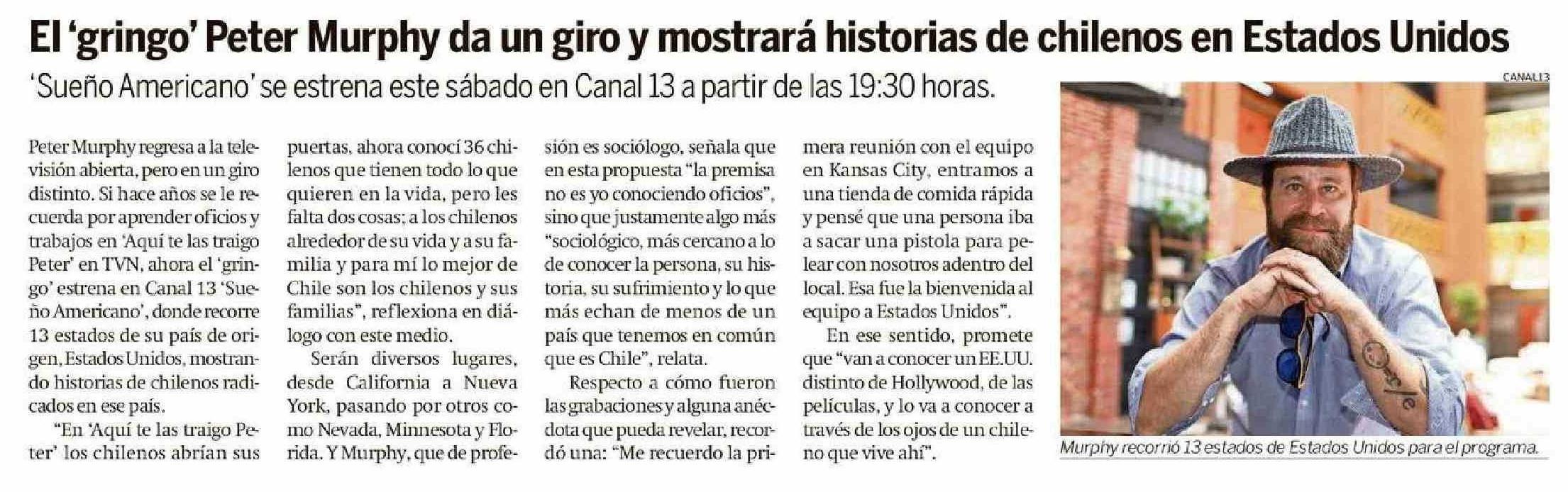 | Título: | El 'gringo' Peter Murphy da un giro y mostrará historias de chilenos en Estados Unidos |