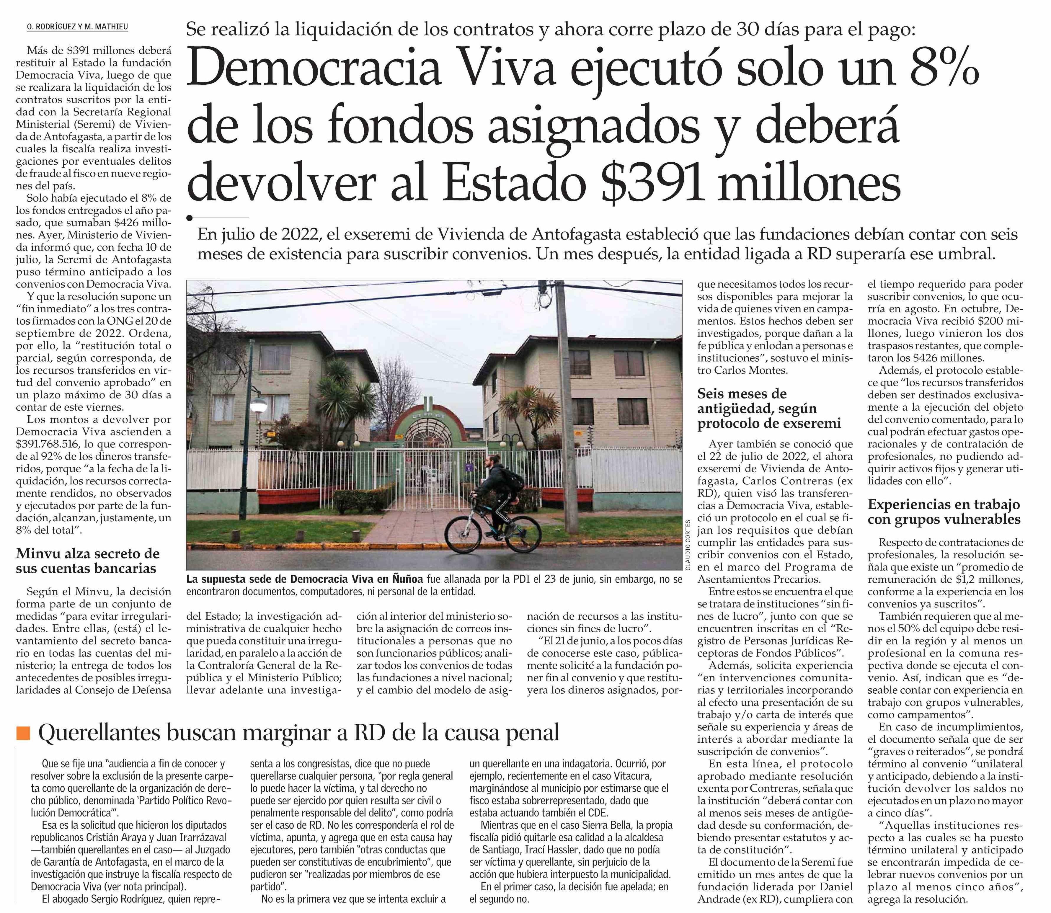 Democracia Viva ejecutó solo un 8% de los fondos asignados y deberá devolver al Estado $391 millones 15-07-2023 El Mercurio |