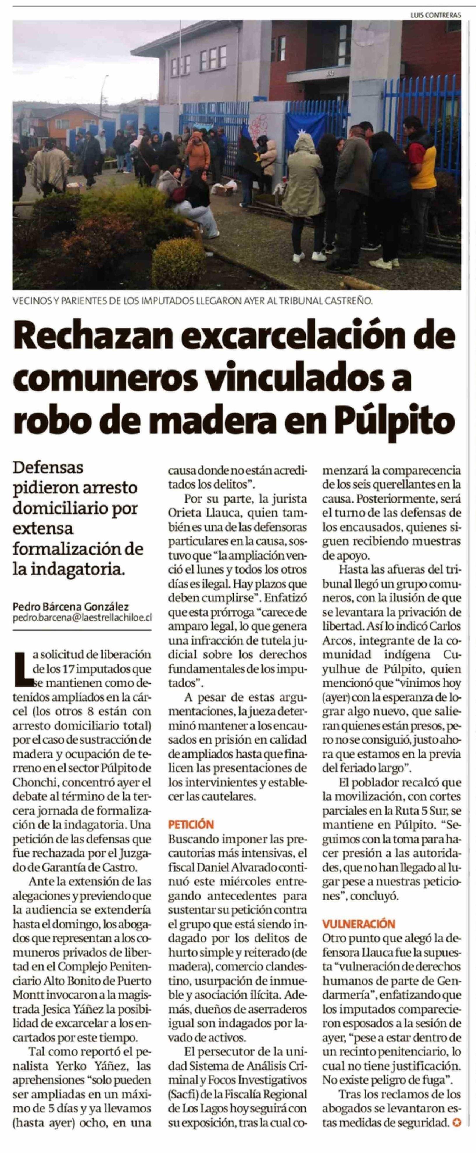 Título: Rechazan excarcelación de comuneros vinculados a robo de madera en Púlpito