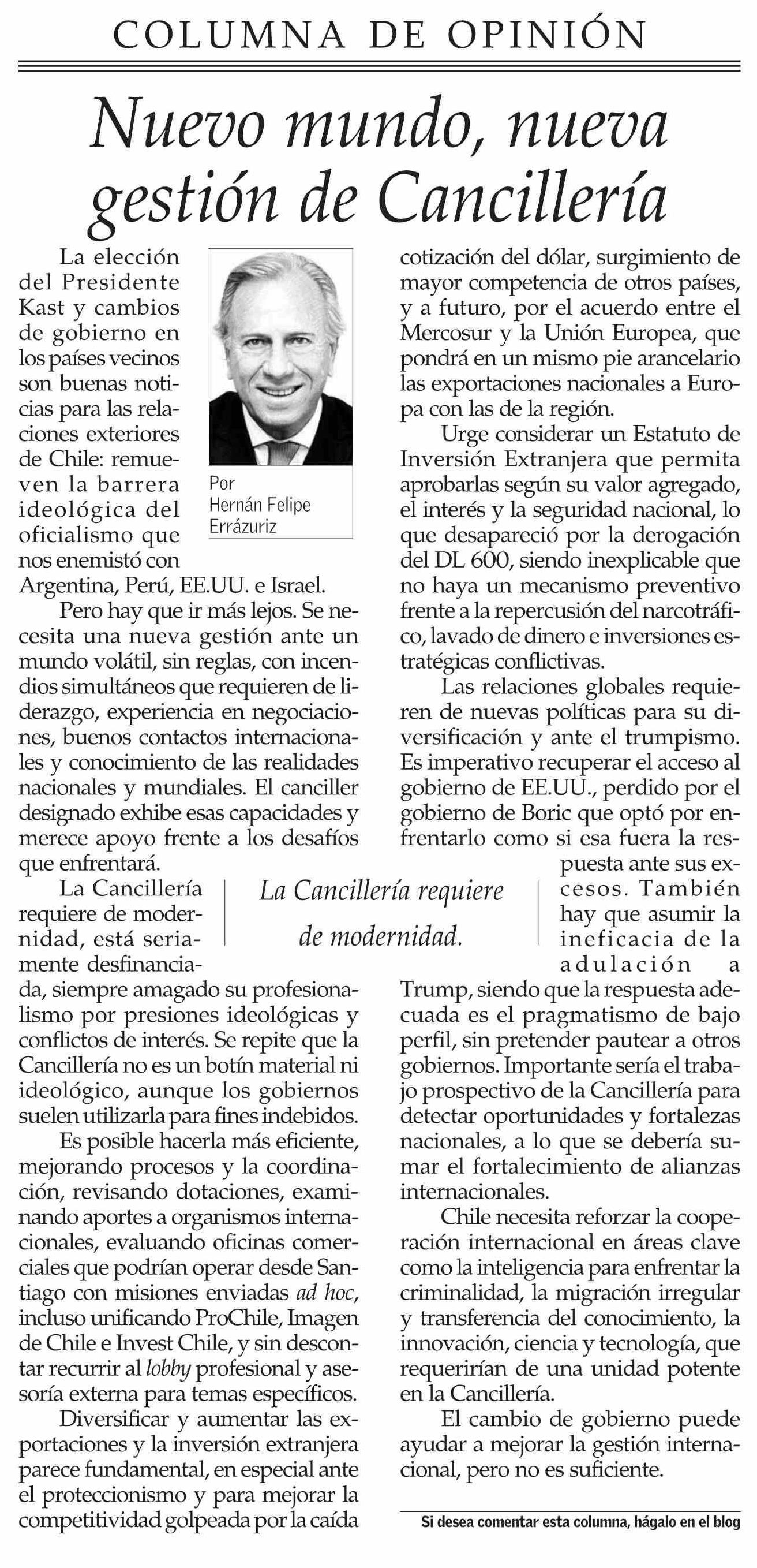 Columnas de Opinión: Nuevo mundo, nueva gestión de Cancillería 24-01-2026 El Mercurio |