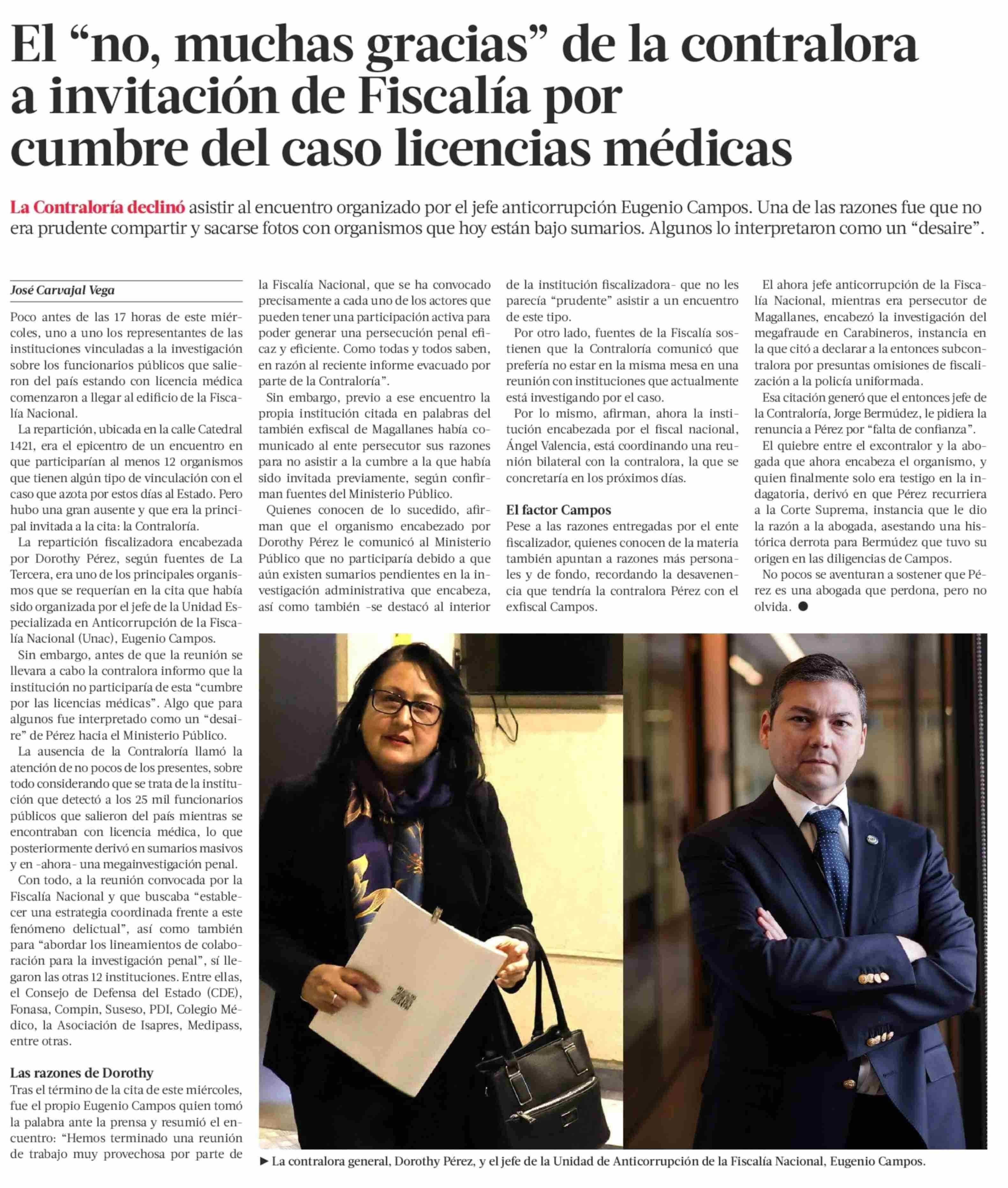 El *no, muchas gracias” de la contralora a invitación de Fiscalía por cumbre del caso licencias médicas 13-06-2025 La Tercera |