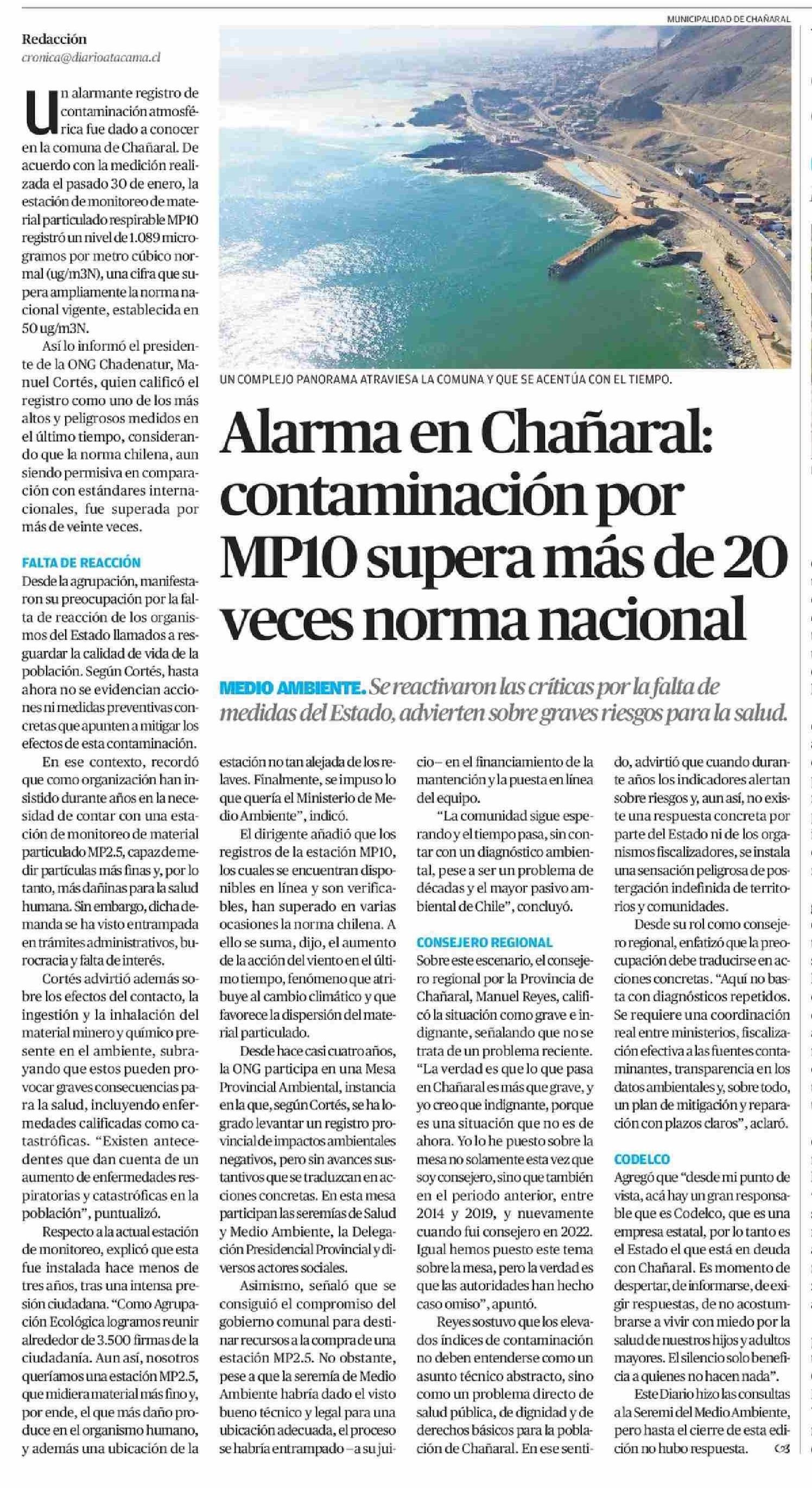 Título: Alarma en Chañaral: contaminación por MP10 supera más de 20 veces norma nacional