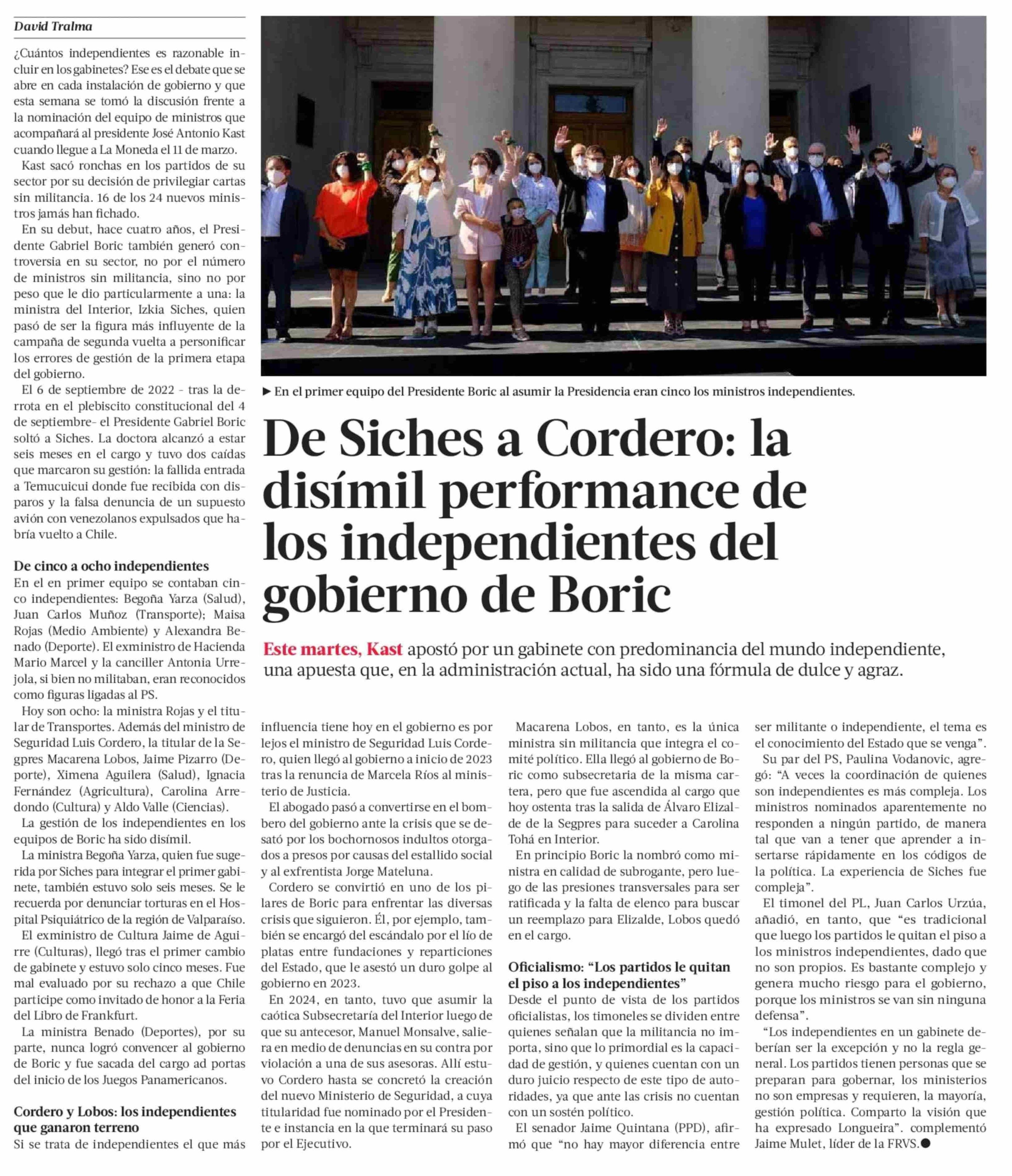 De Siches a Cordero: la disímil performance de los independientes del gobierno de Boric 23-01-2026 La Tercera |