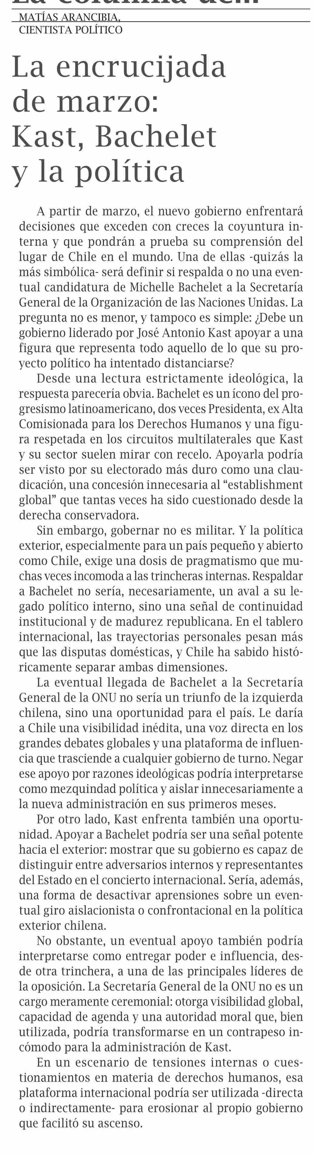 | Título: | Columnas de Opinión: La encrucijada de marzo: Kast, Bachelet y la política |