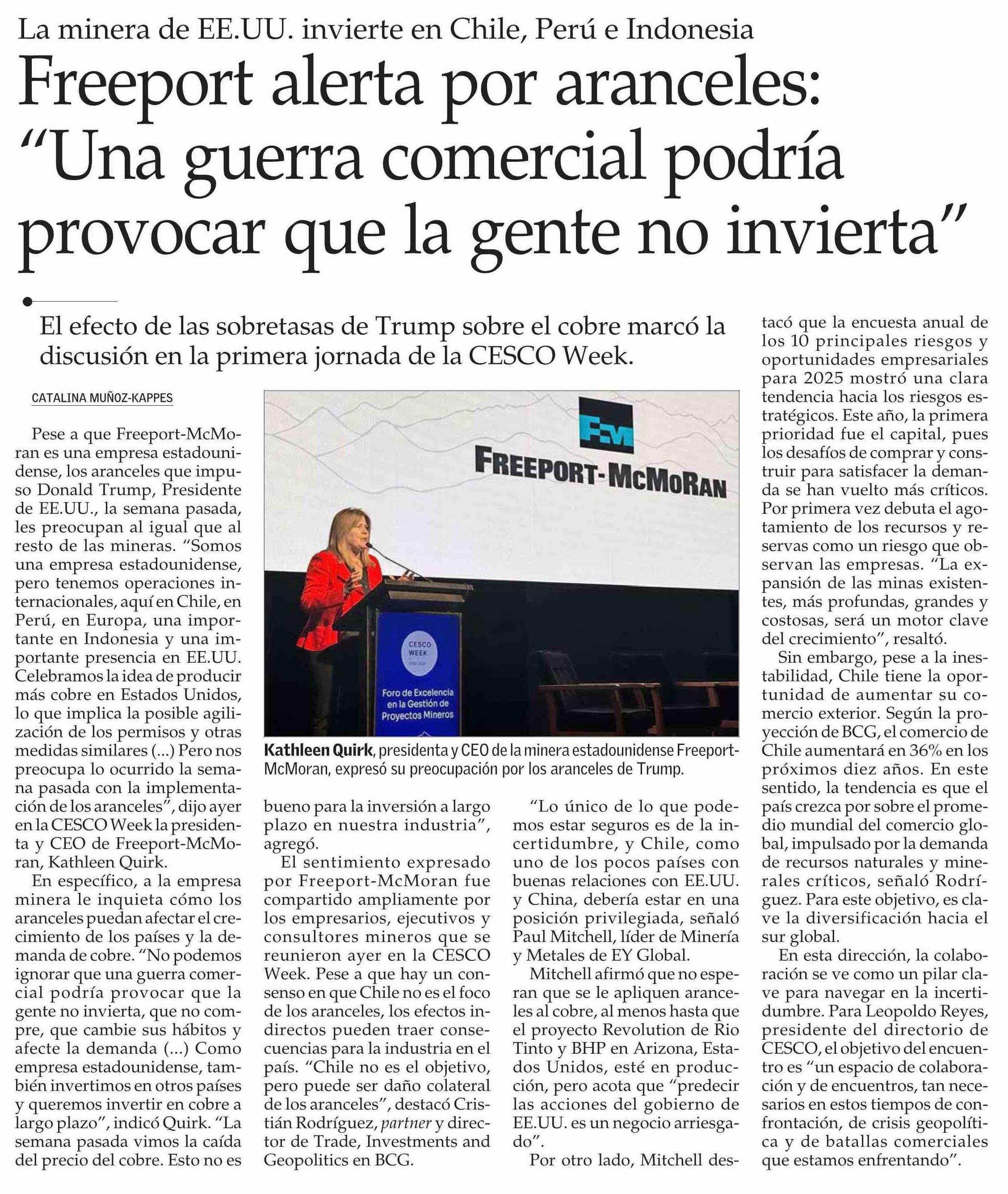 Freeport alerta por aranceles: “Una guerra comercial podría provocar que la gente no invierta” 08-04-2025 El Mercurio |