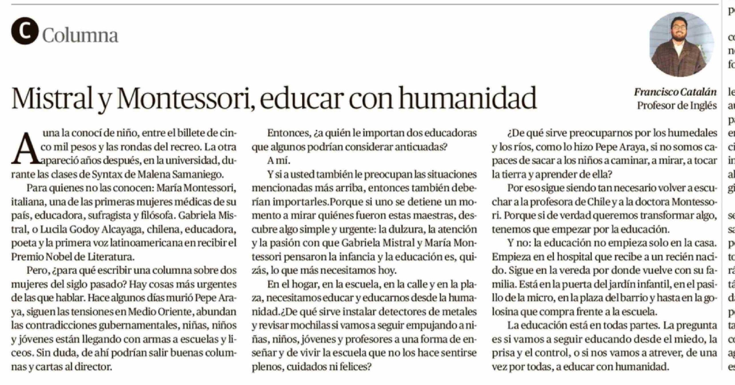 Columnas de Opinión: Mistral y Montessori, educar con humanidad 05-04-2026 Diario Austral Región de Los Ríos |