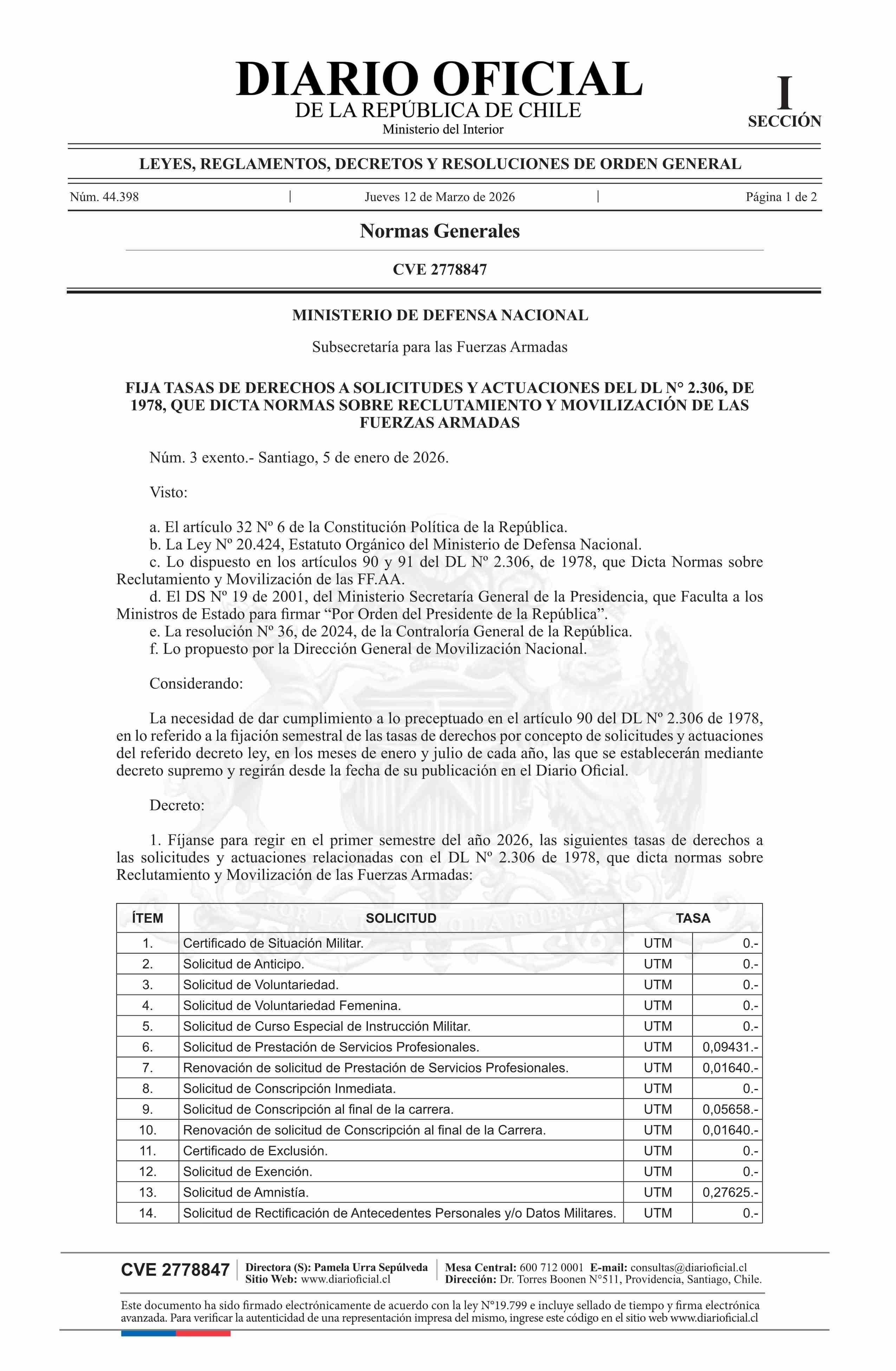 | Título: | Decreto exento número 3, de 2026.- Fija tasas de derechos a solicitudes y actuaciones del DL N° 2.306, de 1978, que dicta normas sobre reclutamiento y movilización de las Fuerzas Armadas |