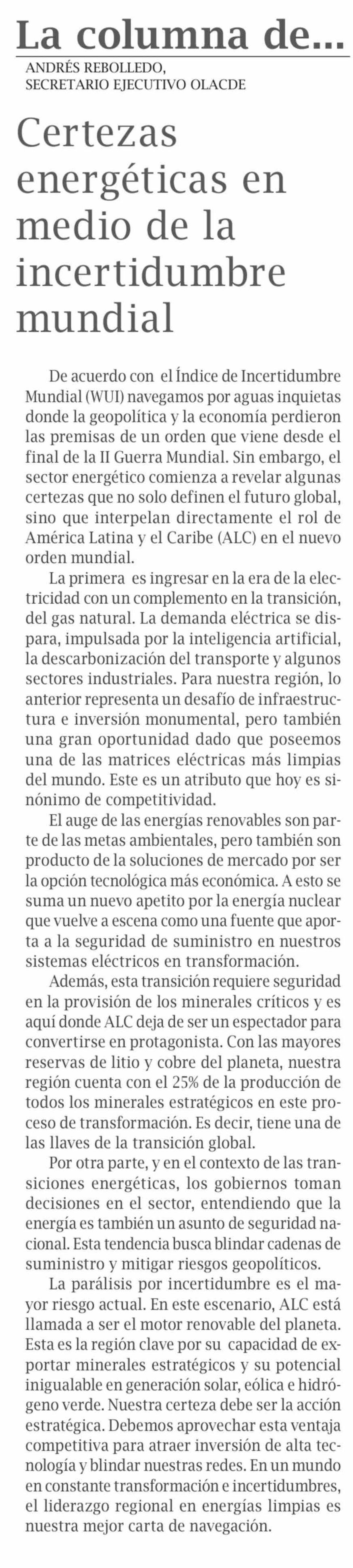 Columnas de Opinión: Certezas energéticas en medio de la incertidumbre mundial 06-02-2026 El Pingüino |