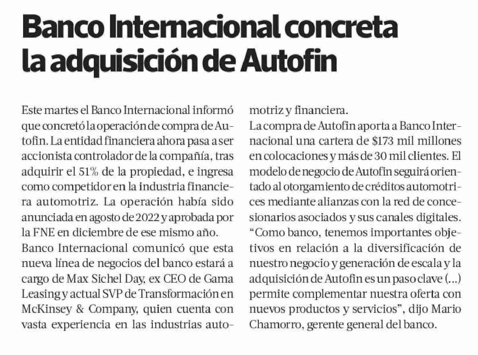 Banco Intemacional concreta la adquisición de Autofin 02-08-2023 La Tercera |