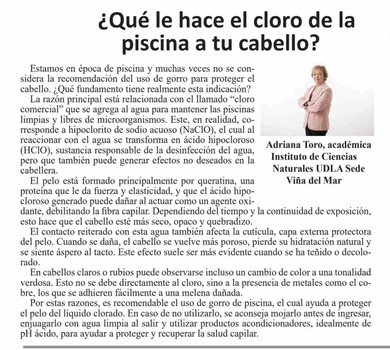 Título: COLUMNAS DE OPINIÓN: ¿Qué le hace el cloro de la piscina a tu cabello?