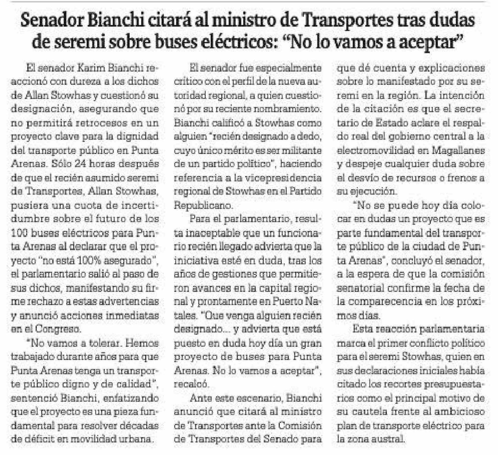 Senador Bianchi citará al ministro de Transportes tras dudas de seremi sobre buses eléctricos: "No lo vamos a aceptar" 03-04-2026 La Prensa Austral |