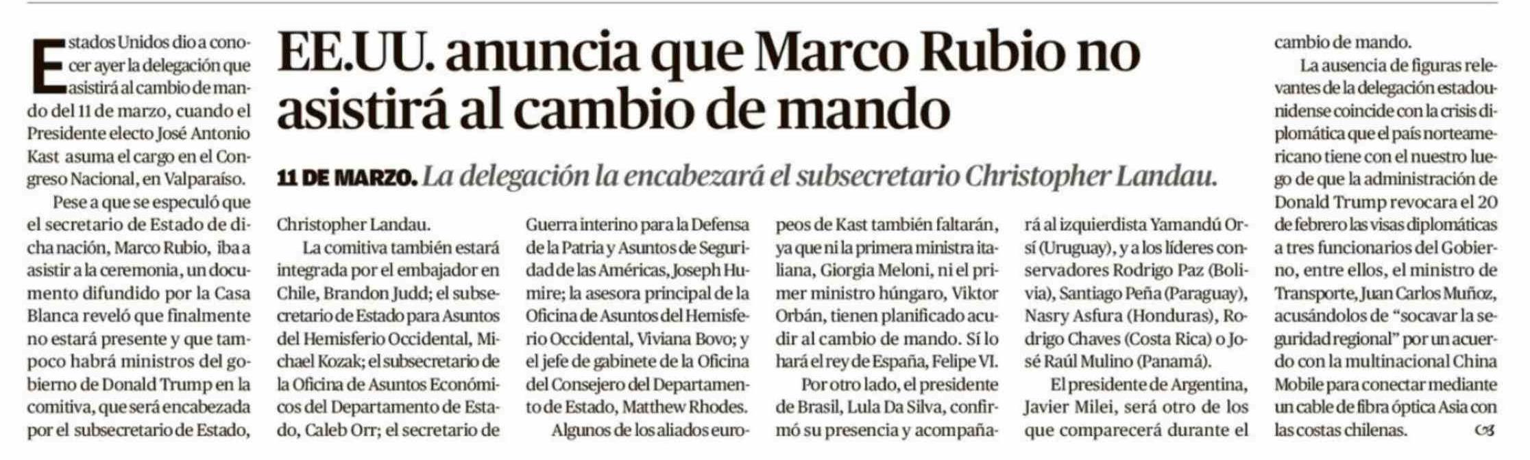 Título: EE.UU. anuncia que Marco Rubio no asistirá al cambio de mando