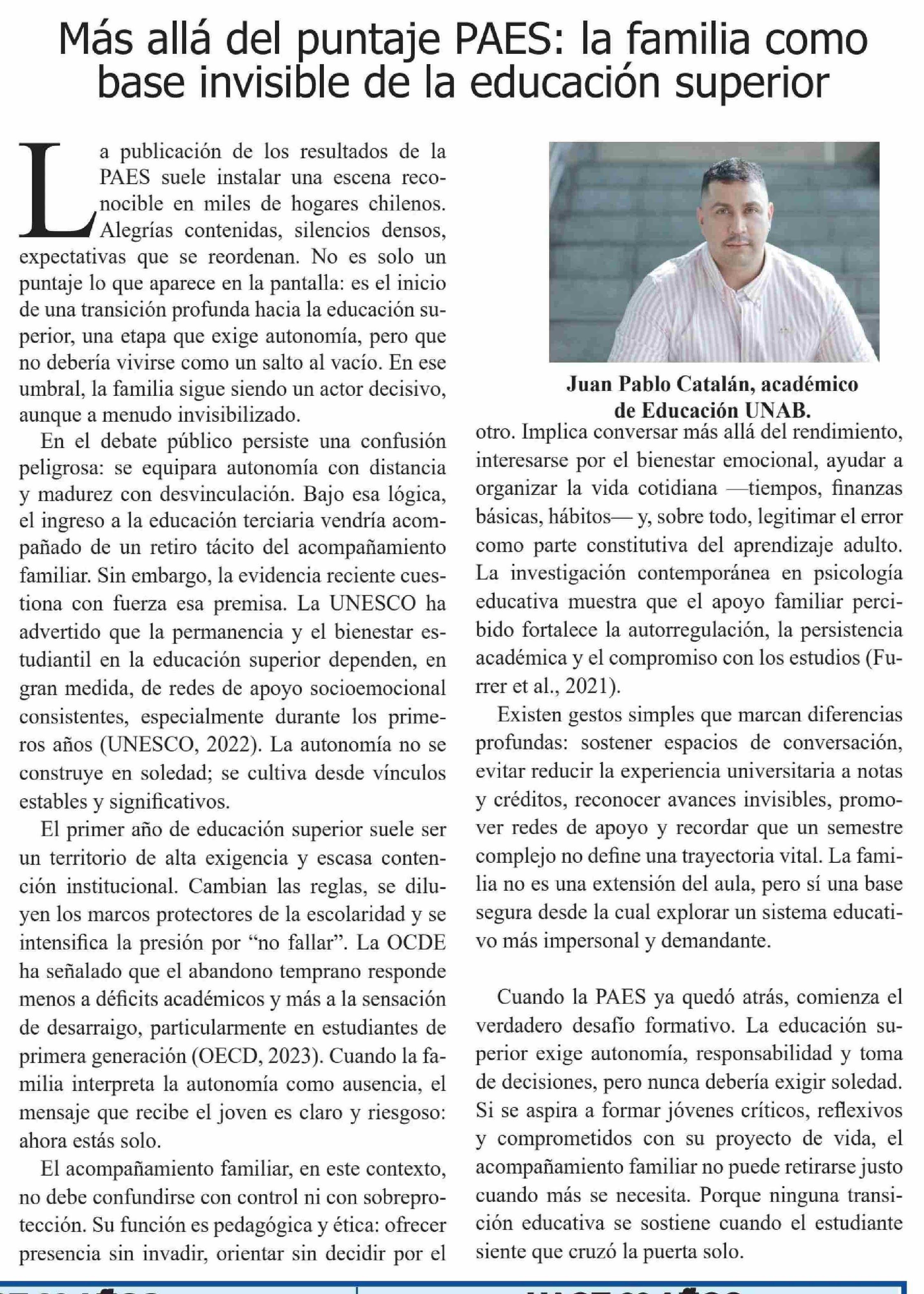 Título: Columnas de Opinión: Más allá del puntaje PAES: la familia como base invisible de la educación superior