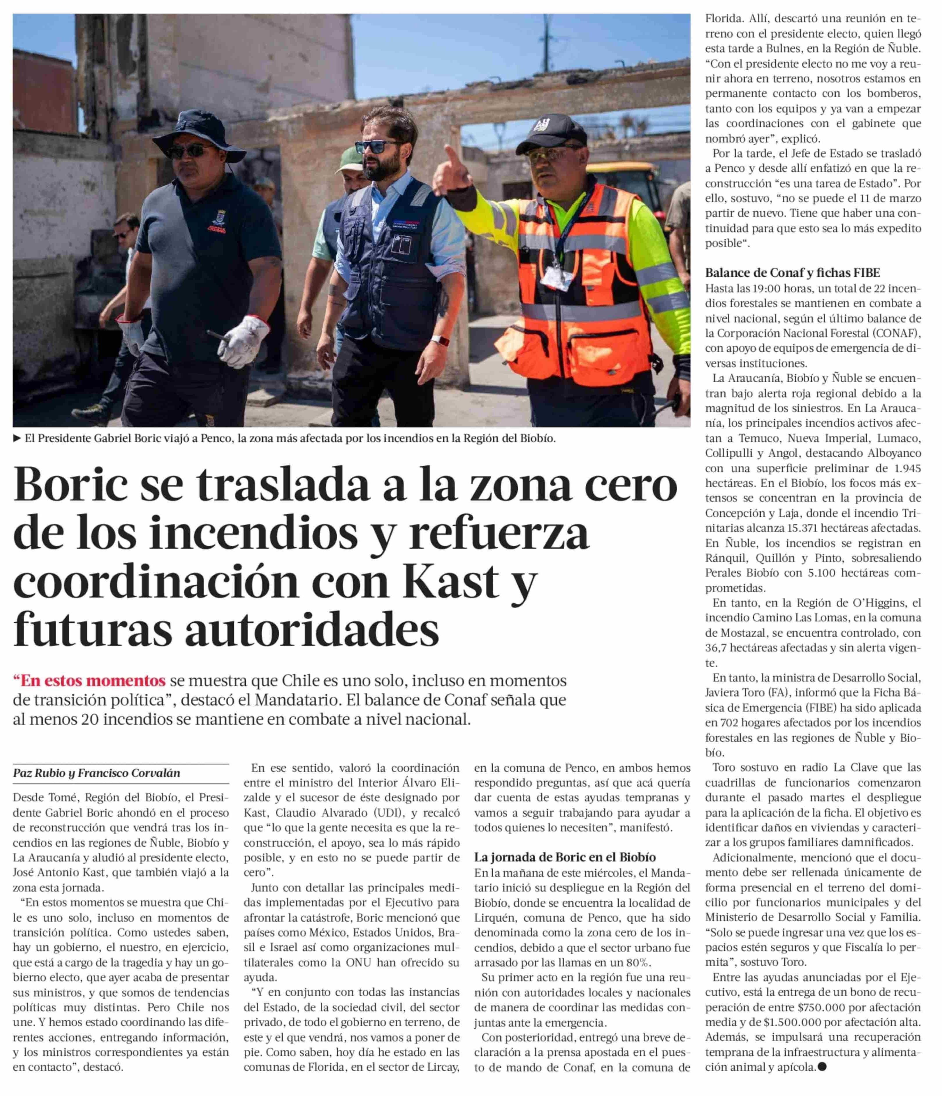 Título: Boric se traslada a la zona cero de los incendios y refuerza coordinación con Kast y futuras autoridades