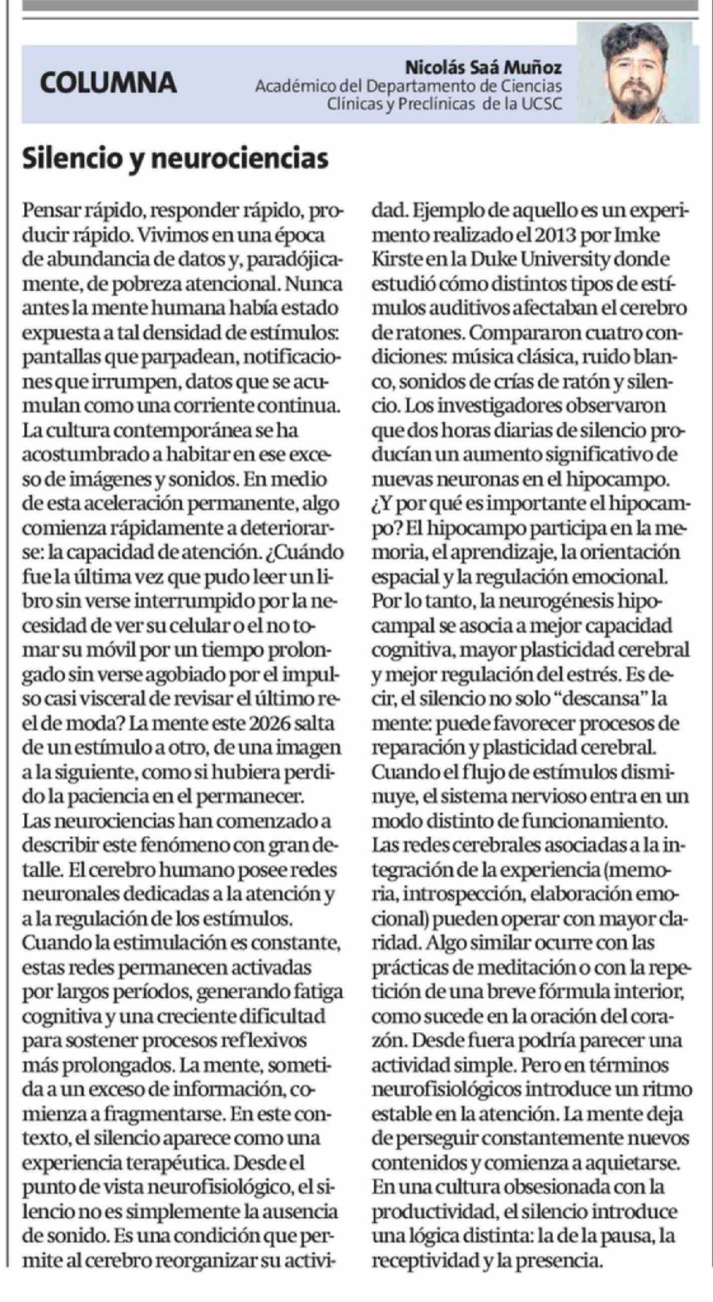 Columnas de Opinión: Silencio y neurociencias 13-04-2026 La Estrella de Concepción |