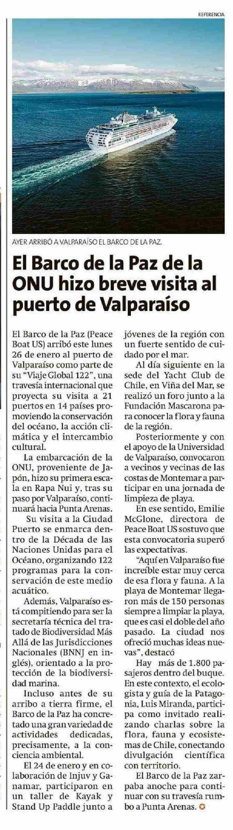 El Barco de la Paz de la ONU hizo breve visita al puerto de Valparaíso 27-01-2026 La Estrella de Valparaíso |