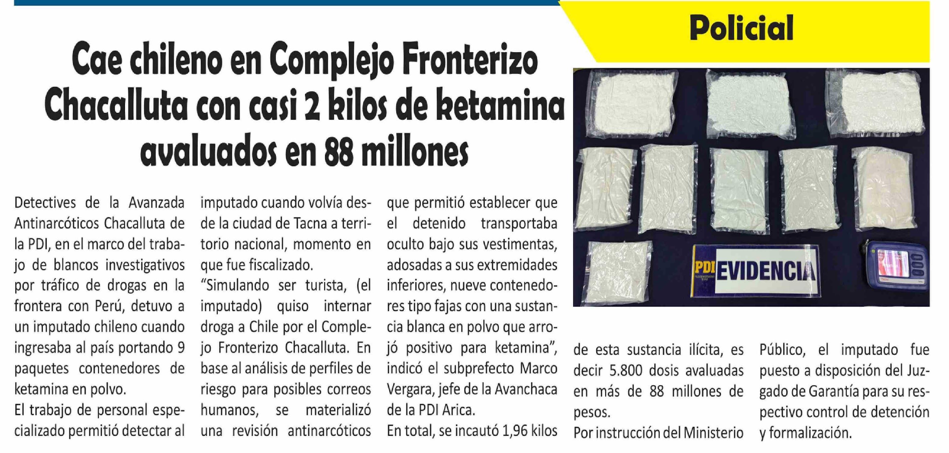 | Título: | Cae chileno en Complejo Fronterizo Chacalluta con casi 2 kilos de ketamina avaluados en 88 millones |