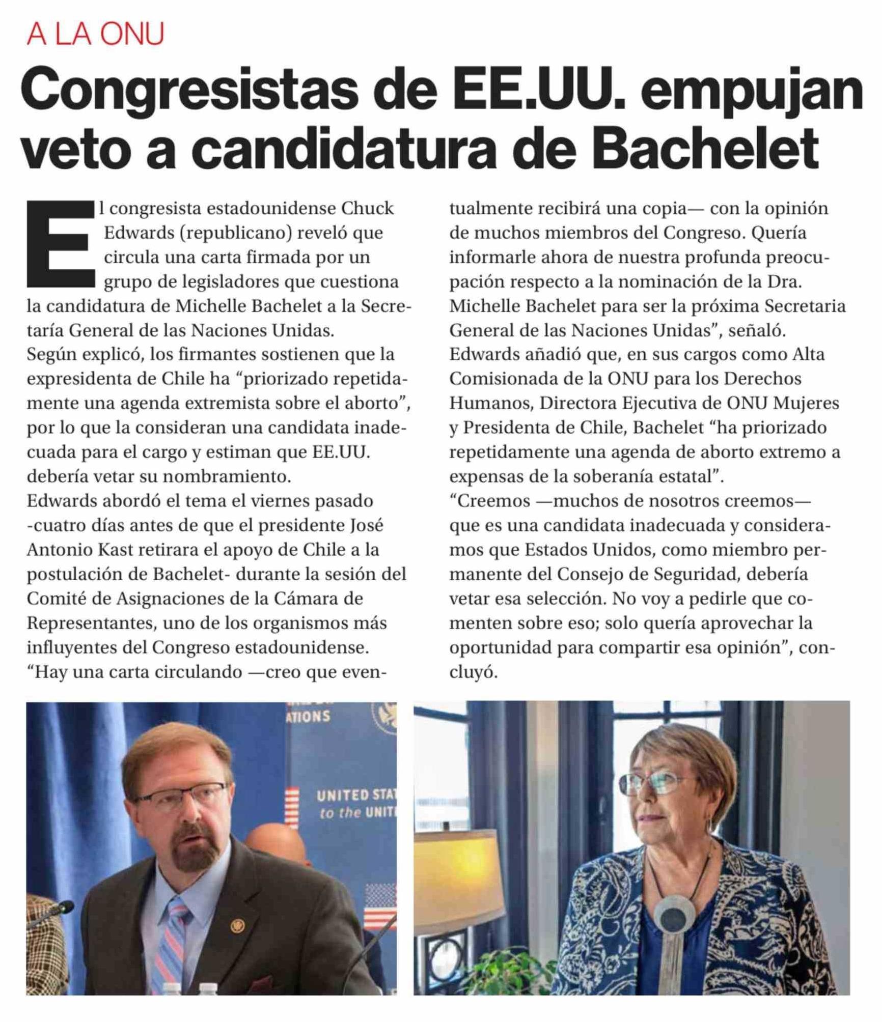 Título: Congresistas de EE.UU. empujan veto a candidatura de Bachelet