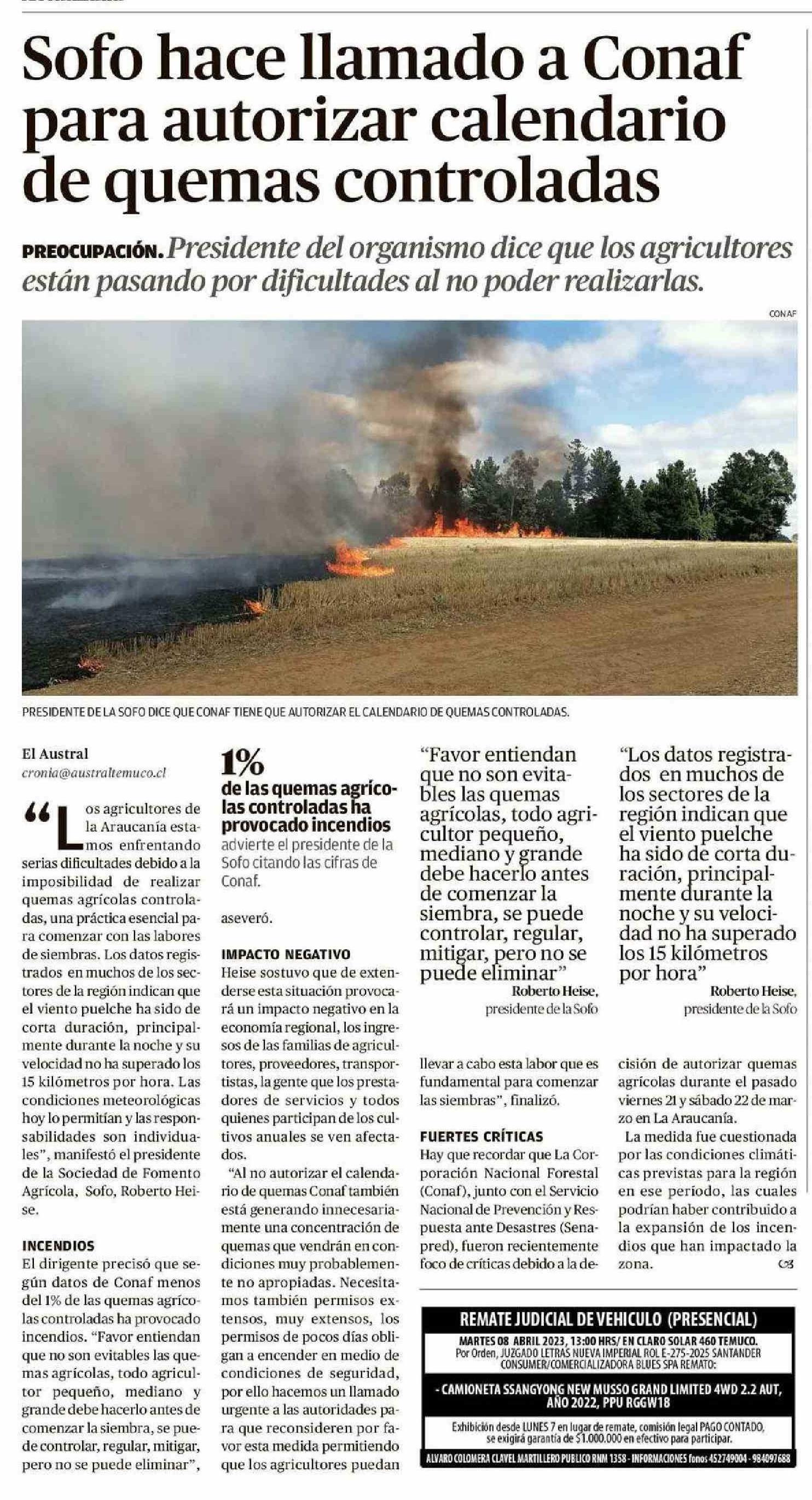 Sofo hace llamado a Conaf para autorizar calendario de quemas controladas 05-04-2025 El Austral de la Araucanía |