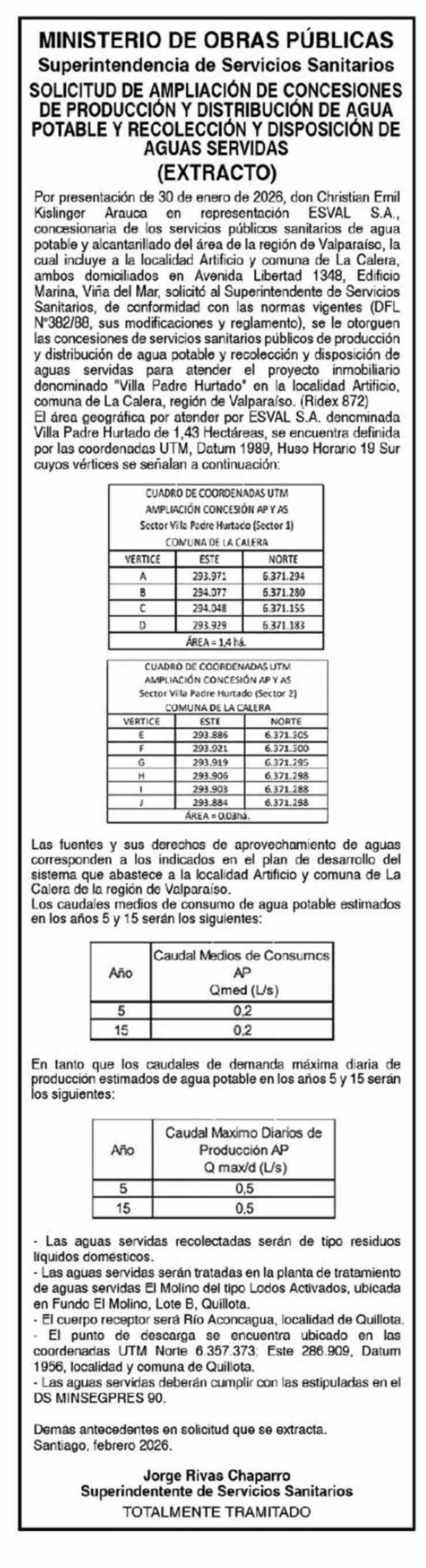 | Título: | Extractos: MINISTERIO DE OBRAS PÚBLICAS Superintendencia de Servicios Sanitarios SOLICITUD DE AMPLIACIÓN DE CONCESIONES DE PRODUCCIÓN Y DISTRIBUCIÓN DE AGUA POTABLE Y RECOLECCIÓN Y DISPOSICIÓN DE AGUAS SERVIDAS (EXTRACTO) Por presentación de 30 de enero de 2026, don Christian Emil Kislinger Arauca e |