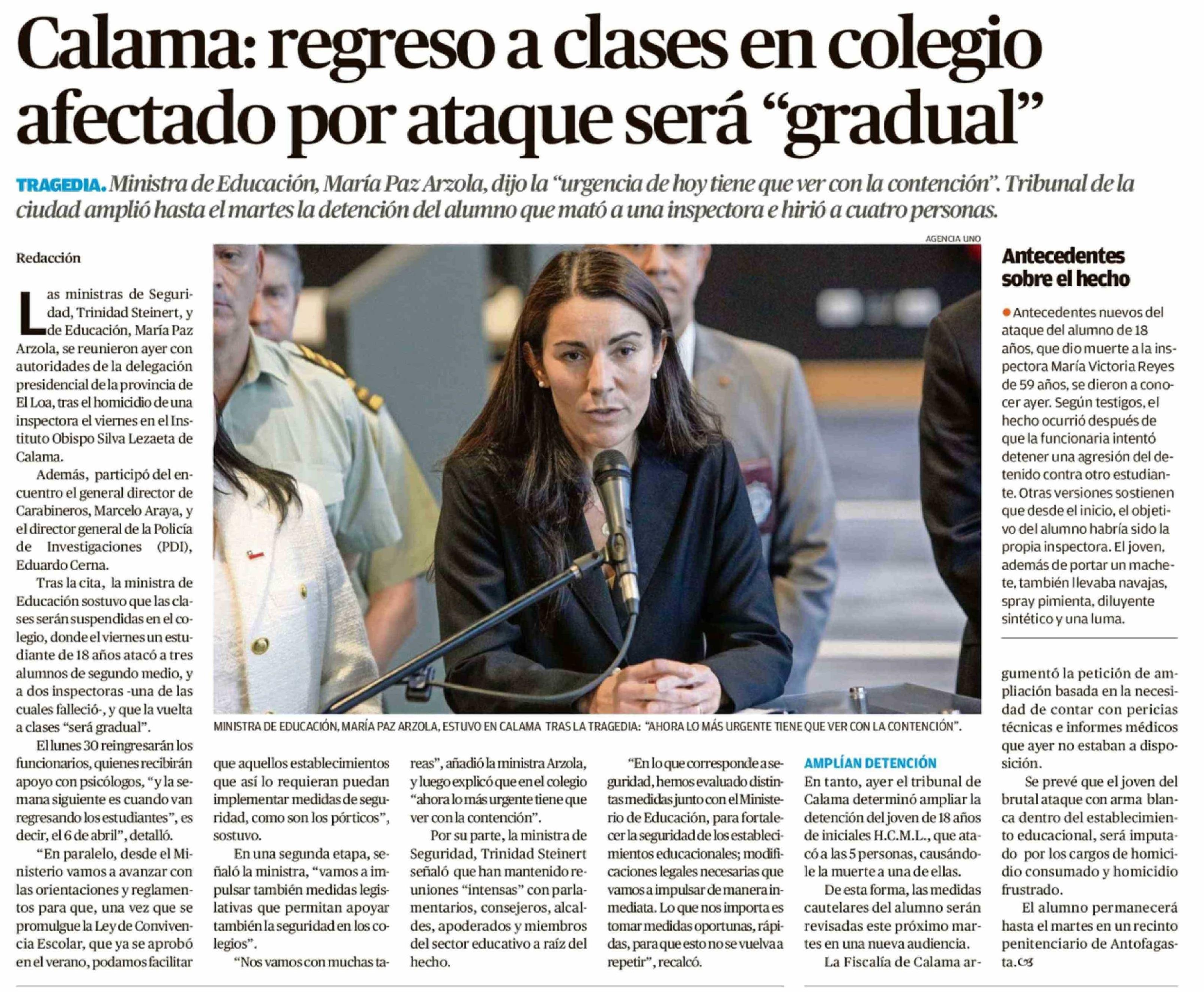 | Título: | Calama: regreso a clases en colegio afectado por ataque será "gradual" |
