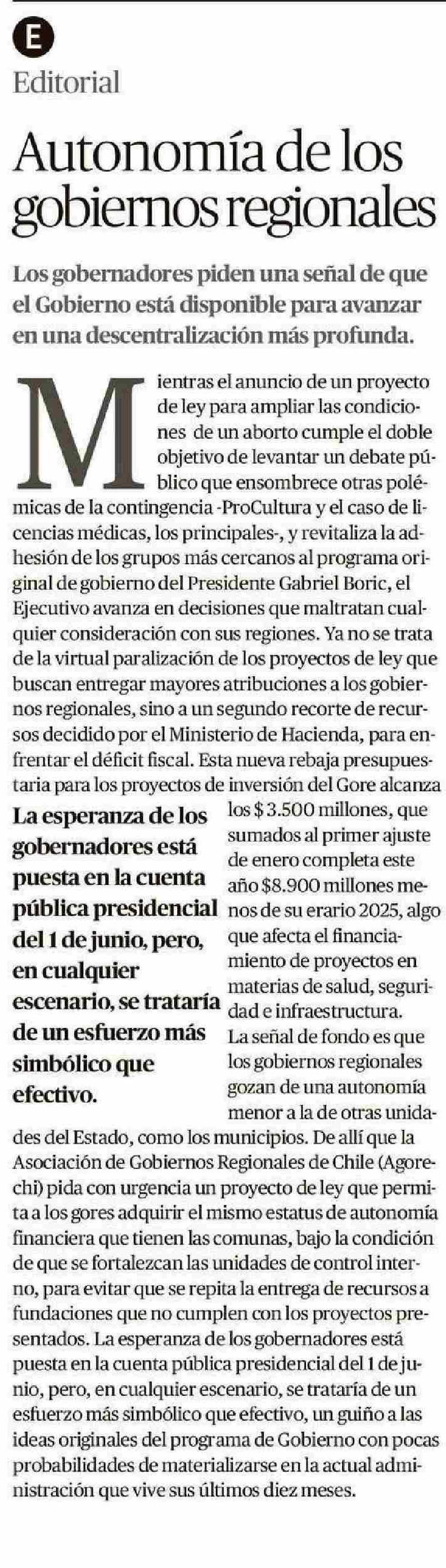 EDITORIAL: Autonomía de los gobiernos regionales 26-05-2025 El Mercurio de Valparaíso |