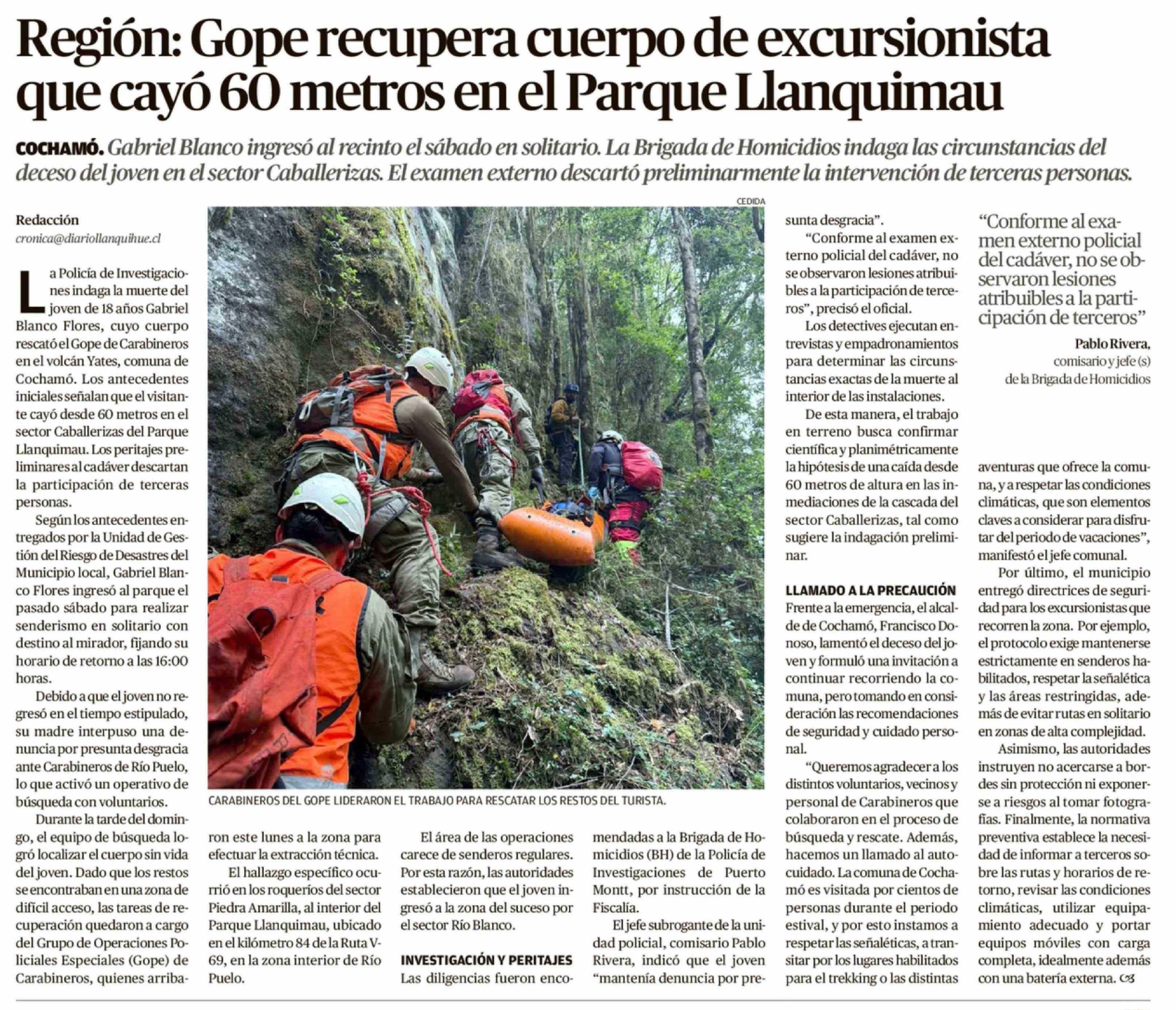 Título: Región: Gope recupera cuerpo de excursionista que cayó 60 metros en el Parque Llanquimau