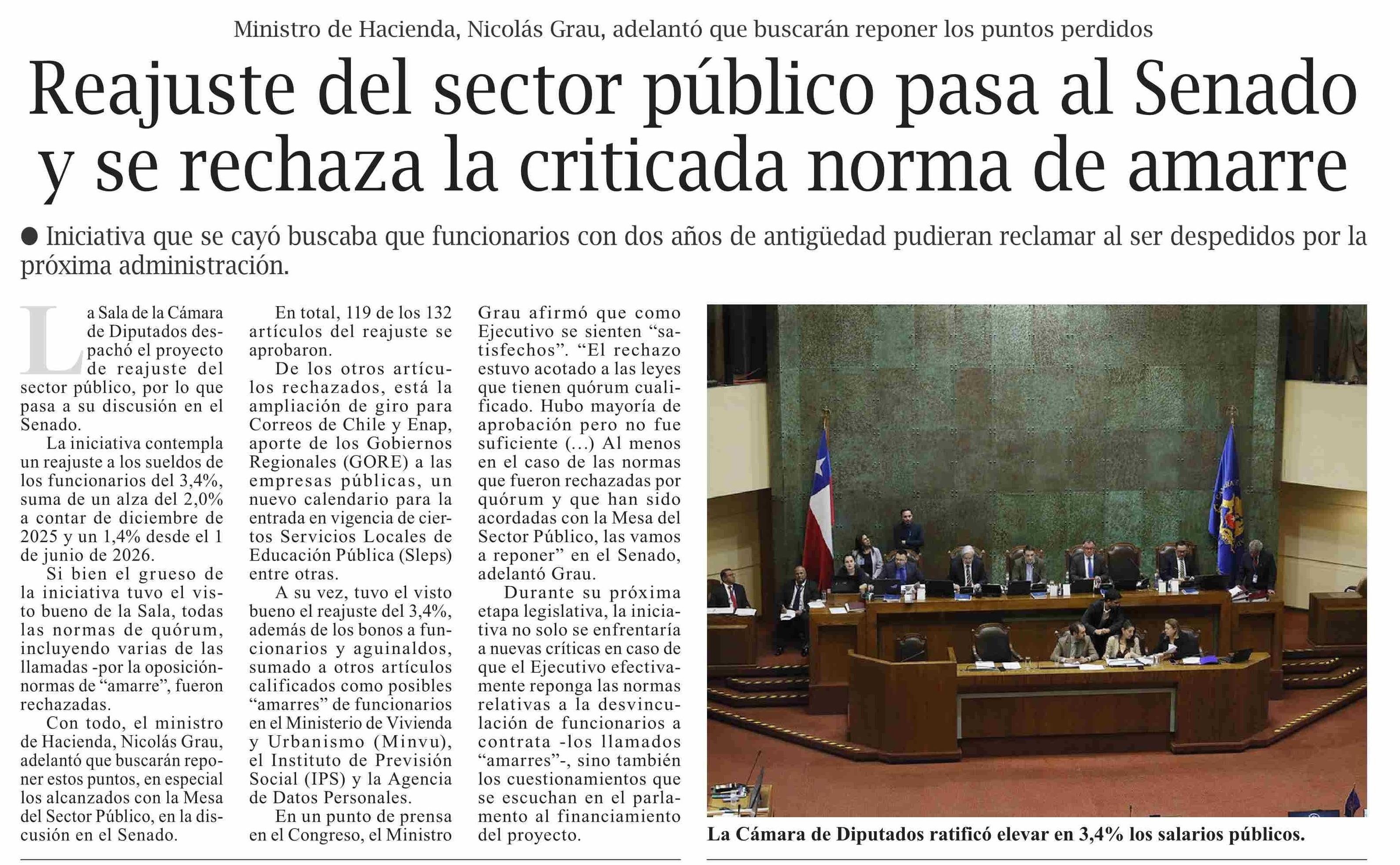 Título: Reajuste del sector público pasa al Senado y se rechaza la criticada norma de amarre
