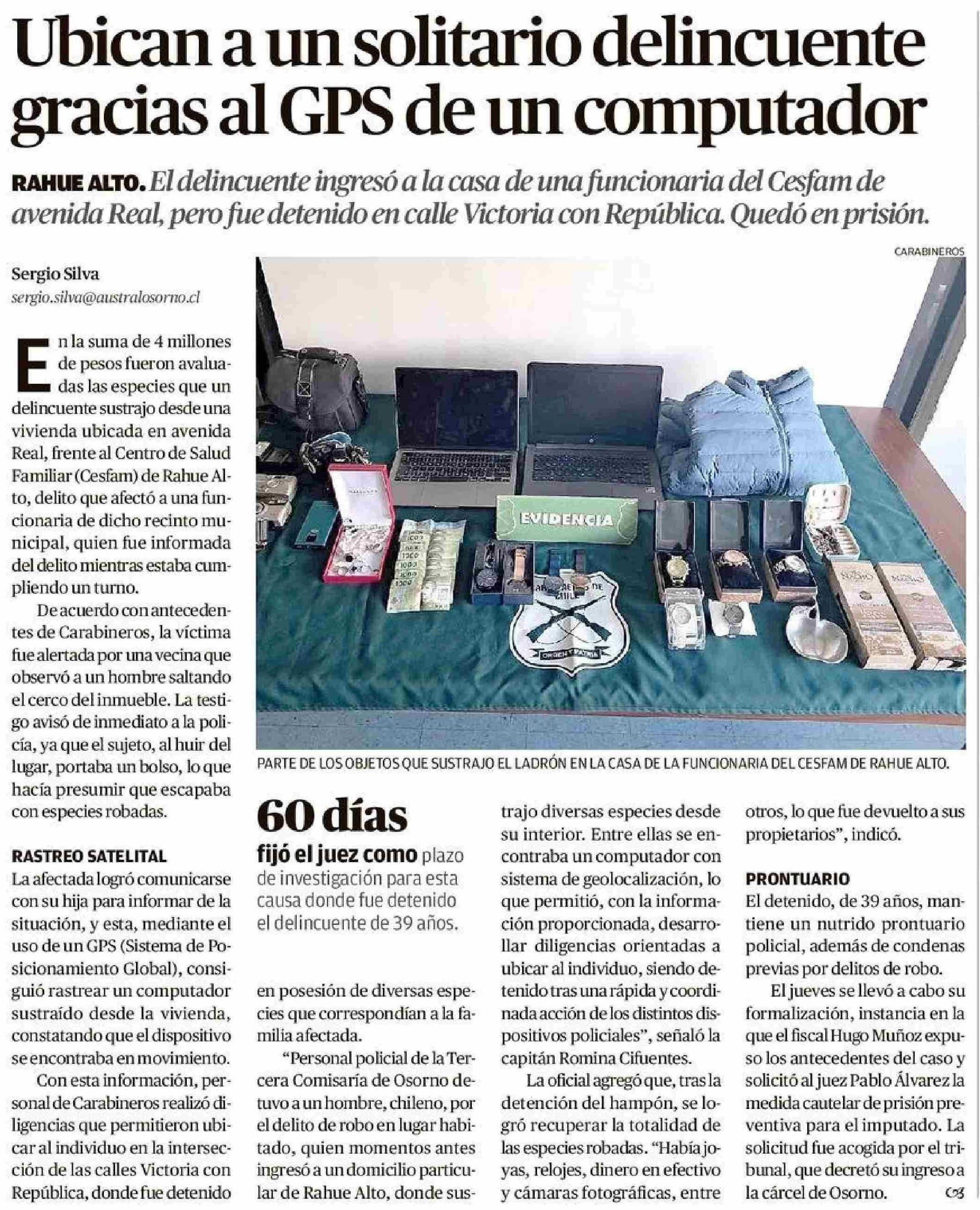 Ubican a un solitario delincuente gracias al GPS de un computador 17-04-2026 El Austral de Osorno |