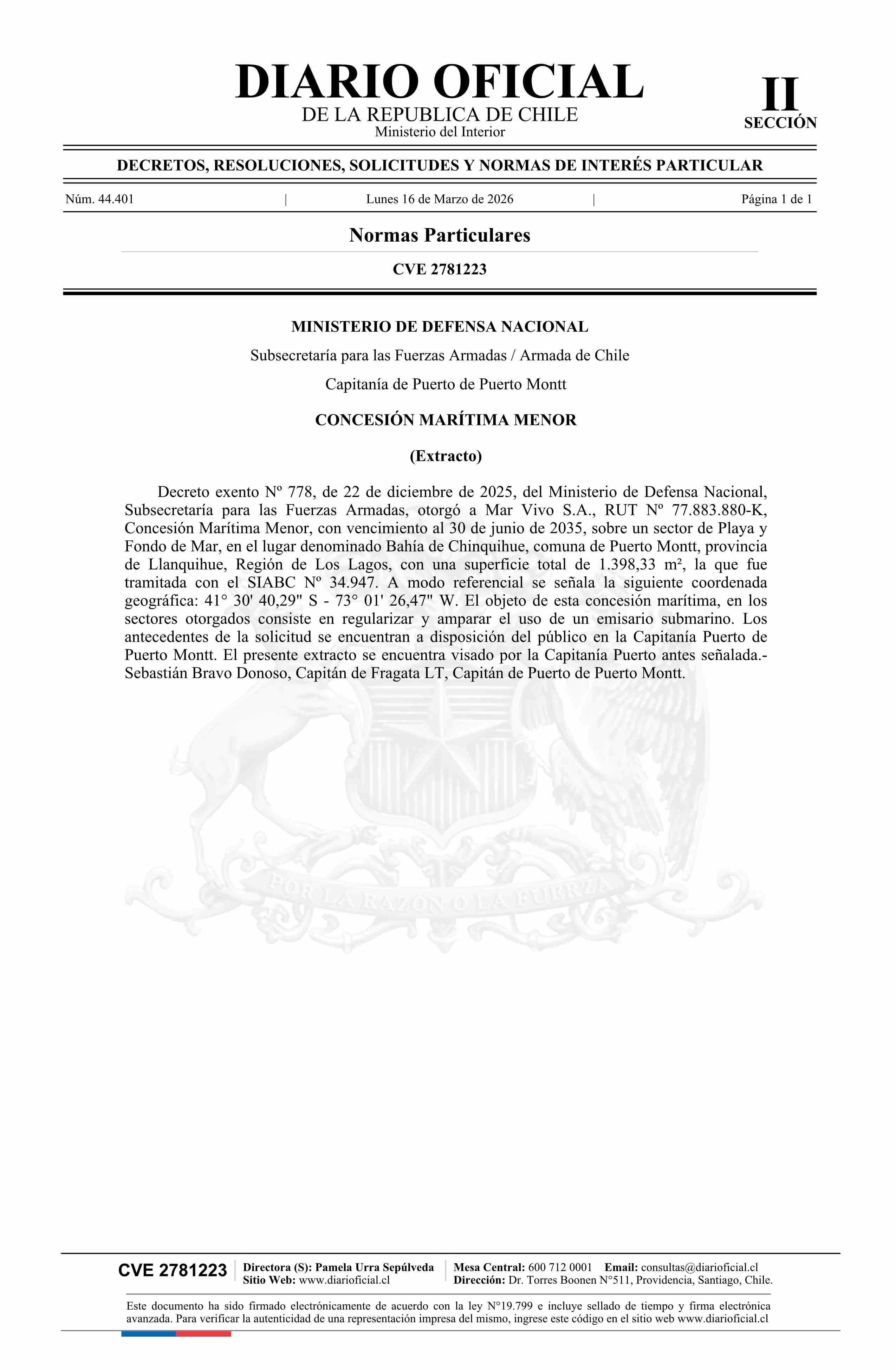 Extracto de decreto exento número 778, de 2025.- Concesión marítima menor 16-03-2026 Diario Oficial Edición Electrónica |