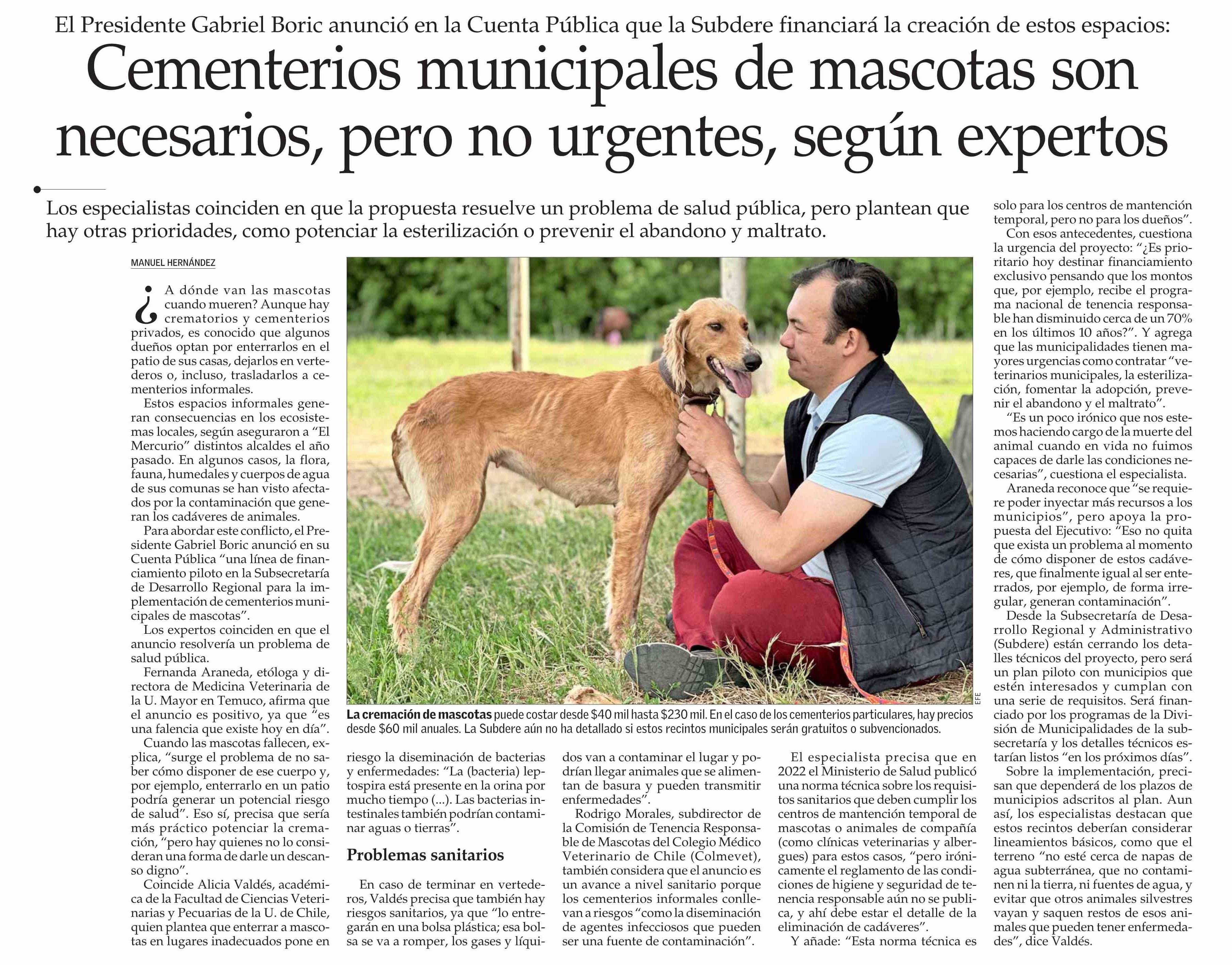 Cementerios municipales de mascotas son necesarios, pero no urgentes, según expertos 03-06-2025 El Mercurio |
