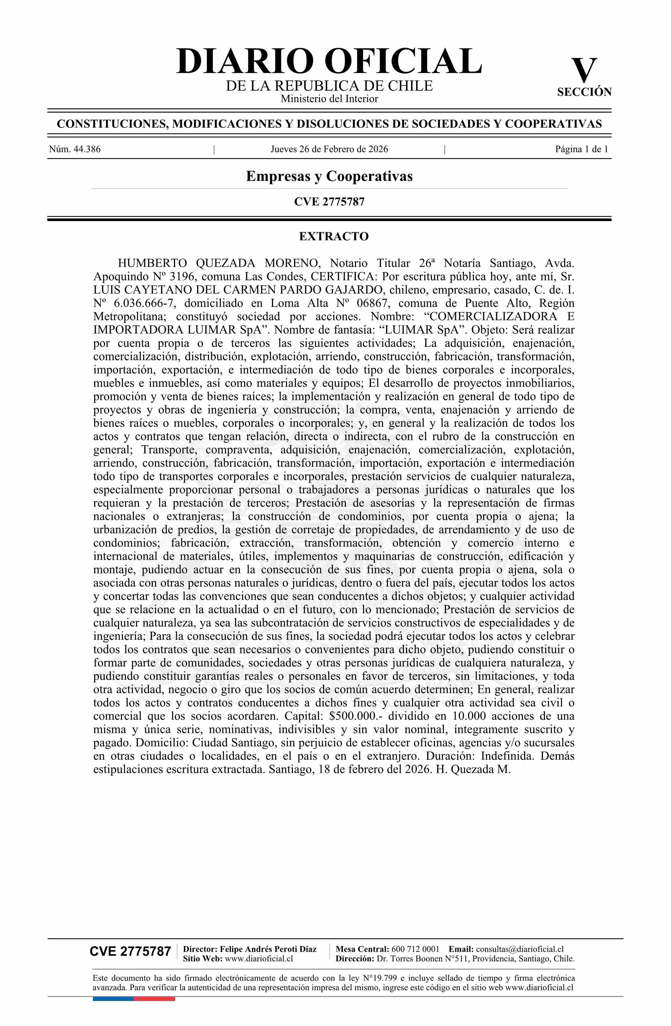 COMERCIALIZADORA E IMPORTADORA LUIMAR SpA 26-02-2026 Diario Oficial Edición Electrónica |