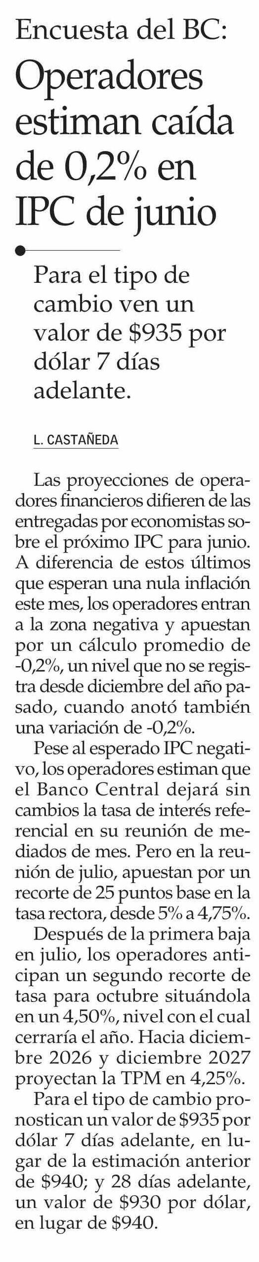 Operadores estiman caída de 0,2% en IPC de junio 13-06-2025 El Mercurio |