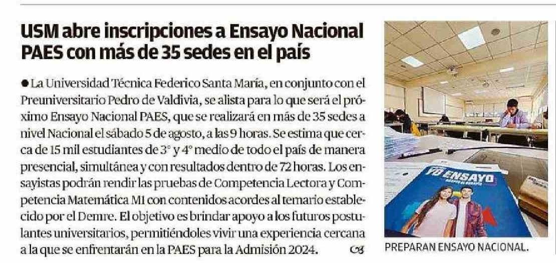 USM abre inscripciones a Ensayo Nacional PAES con más de 35 sedes en el país 28-07-2023 El Mercurio de Valparaíso |
