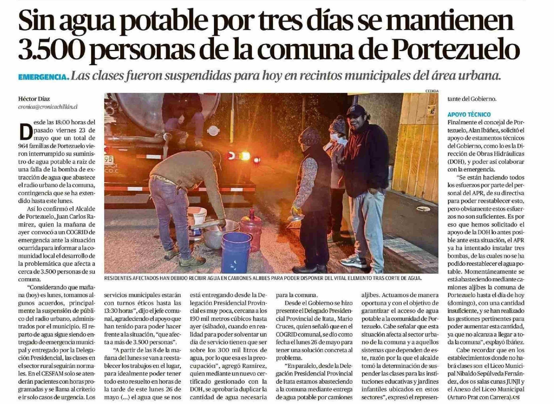 | Título: | Sin agua potable por tres días se mantienen 3.500 personas de la comuna de Portezuelo |