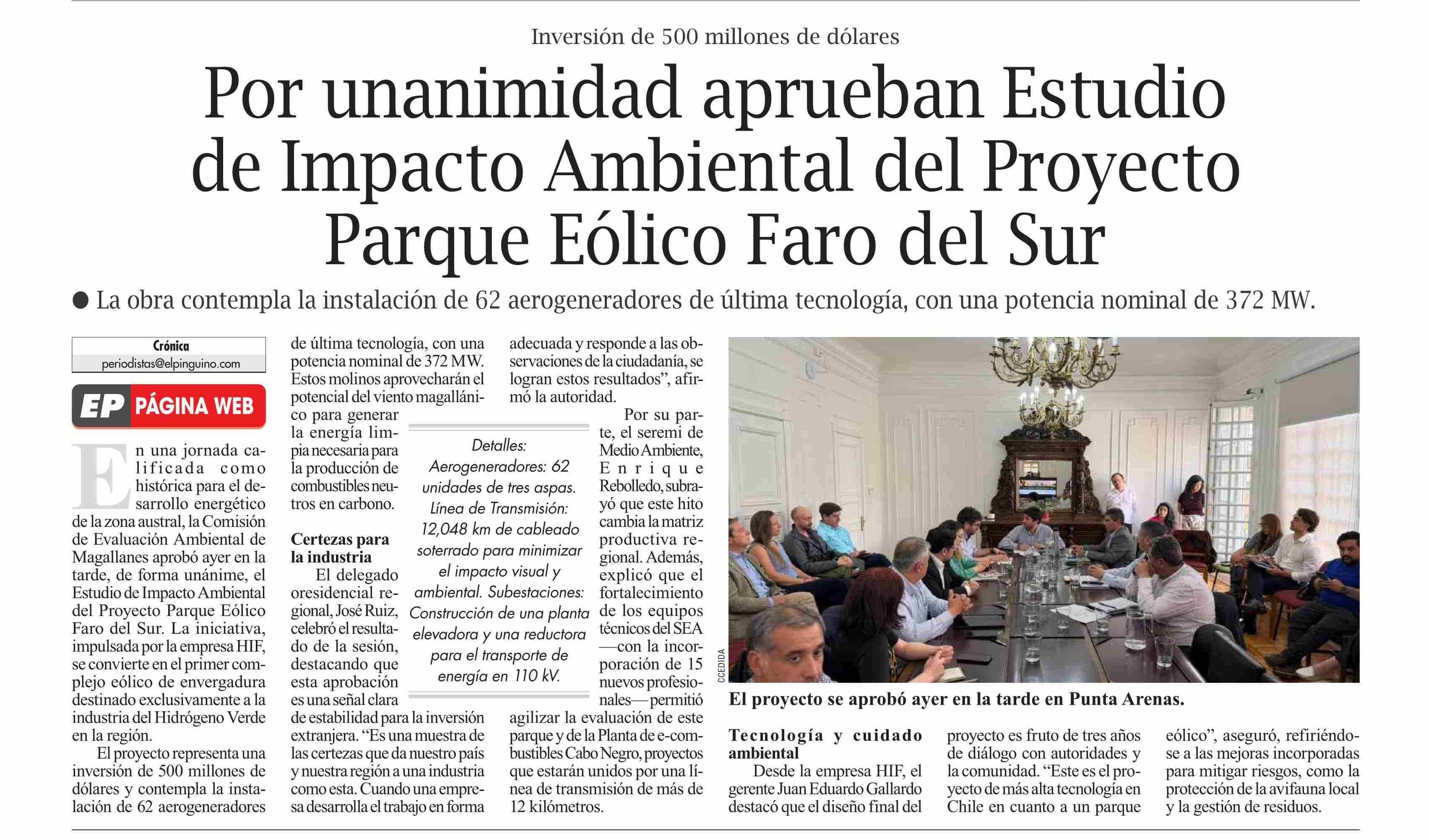 Título: Por unanimidad aprueban Estudio de Impacto Ambiental del Proyecto Parque Eólico Faro del Sur