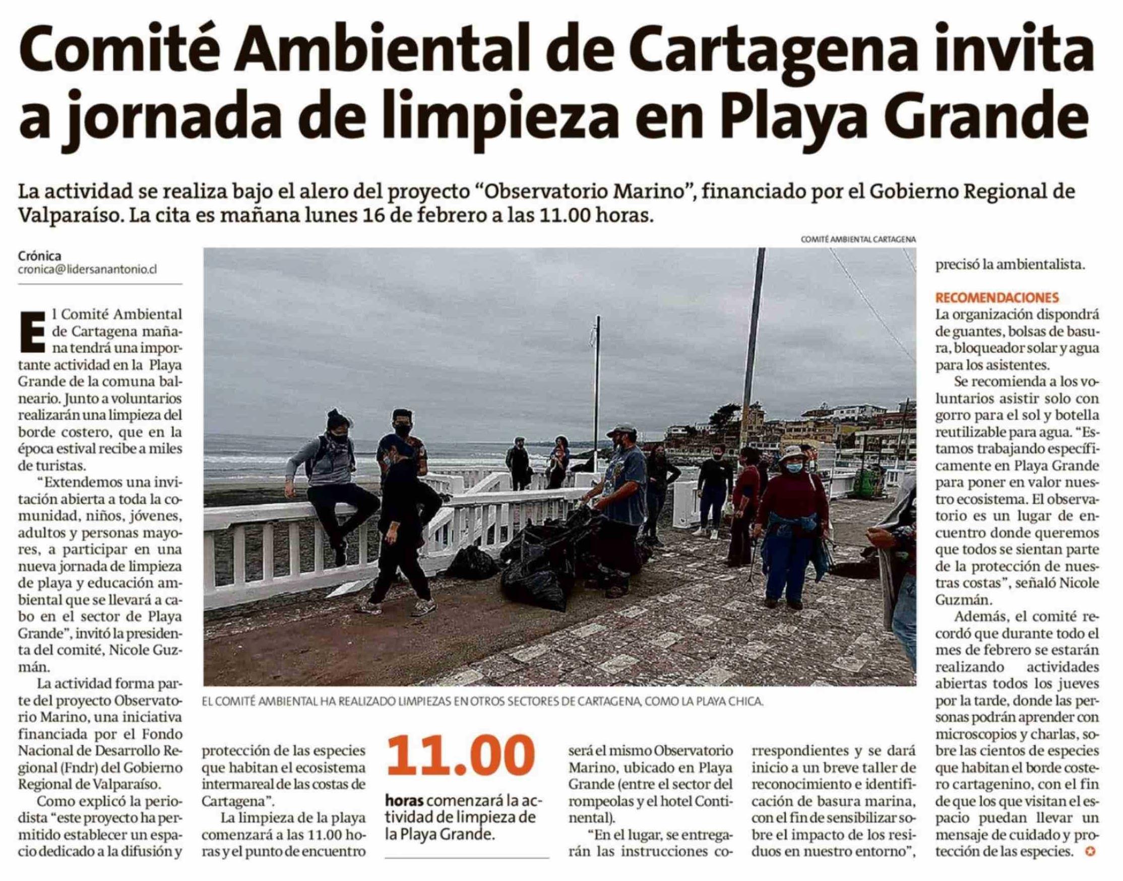 Comité Ambiental de Cartagena invita a jornada de limpieza en Playa Grande 15-02-2026 El Líder |