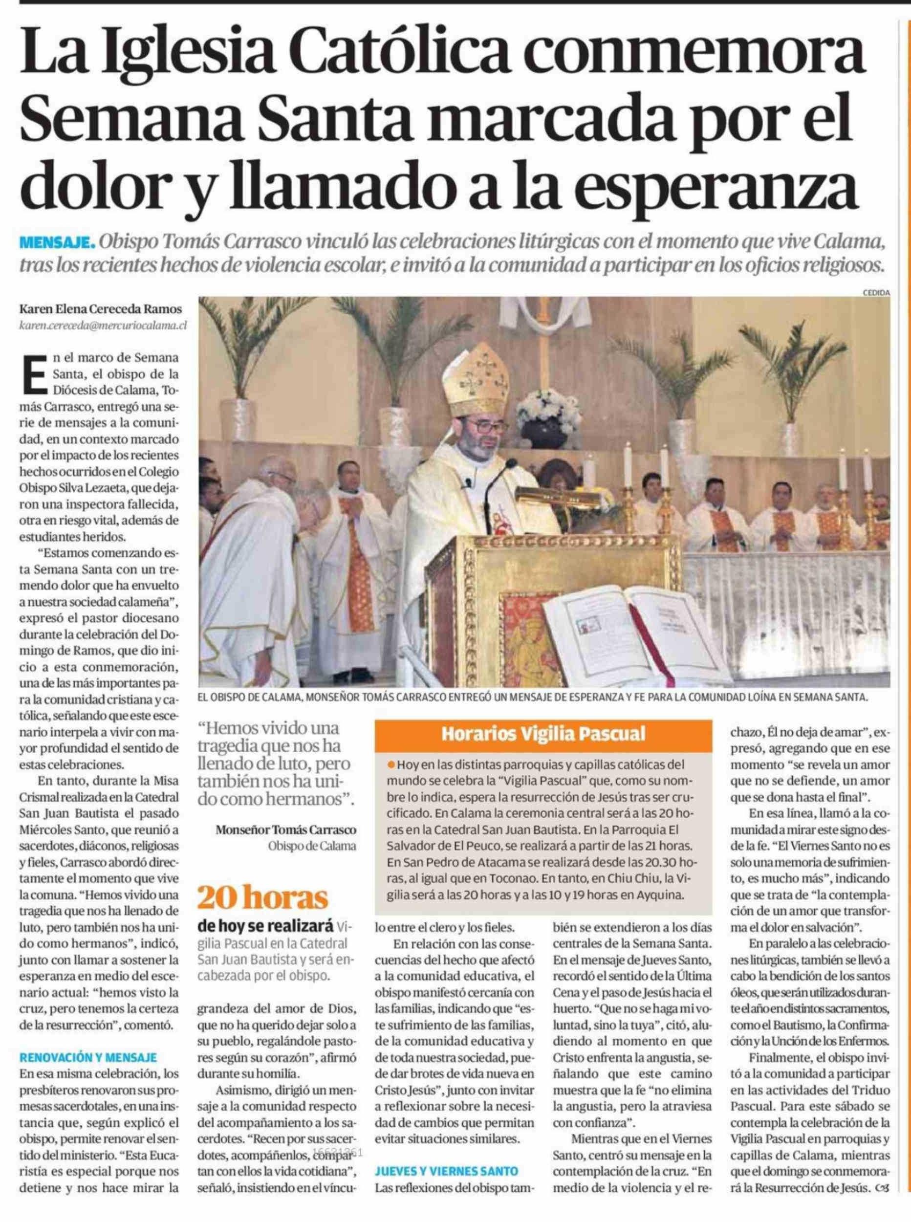 La Iglesia Católica conmemora Semana Santa marcada por el dolor y llamado a la esperanza 04-04-2026 El Mercurio de Calama |
