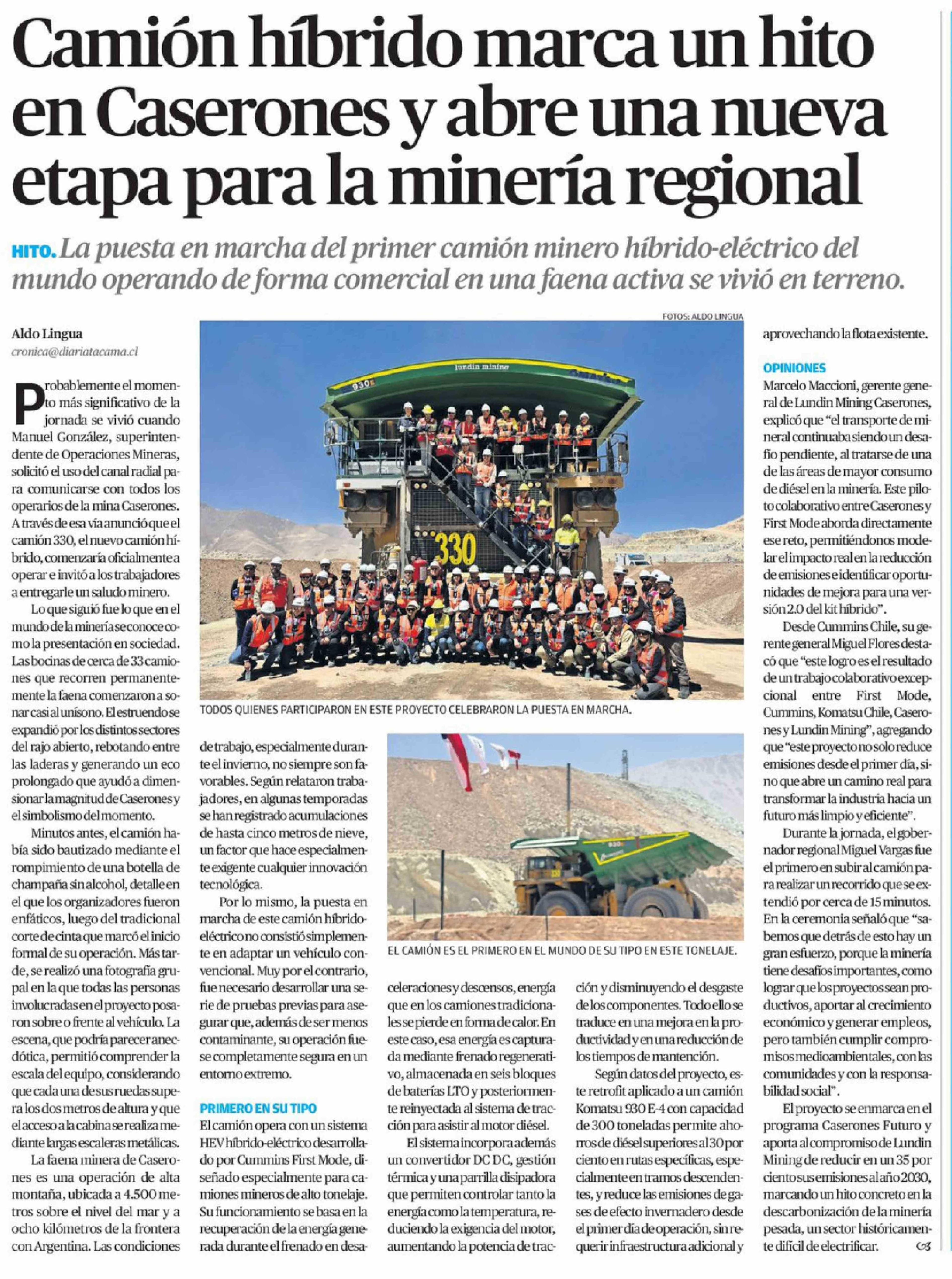 Camión híbrido marca un hito en Caserones y abre una nueva etapa para la minería regional 11-02-2026 El Diario de Atacama |