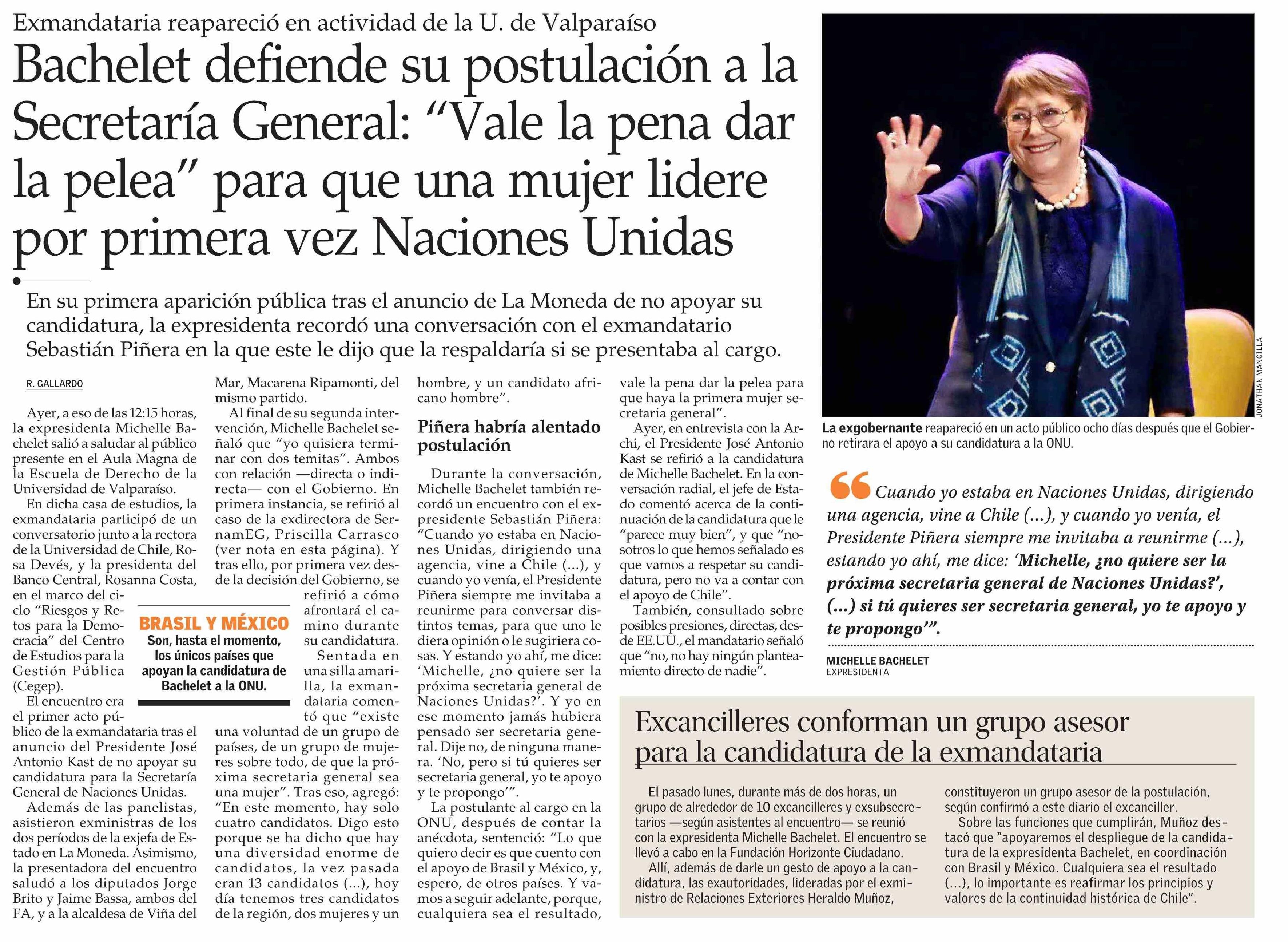 Título: Bachelet defiende su postulación a la Secretaría General: “Vale la pena dar la pelea” para que una mujer lidere por primera vez Naciones Unidas