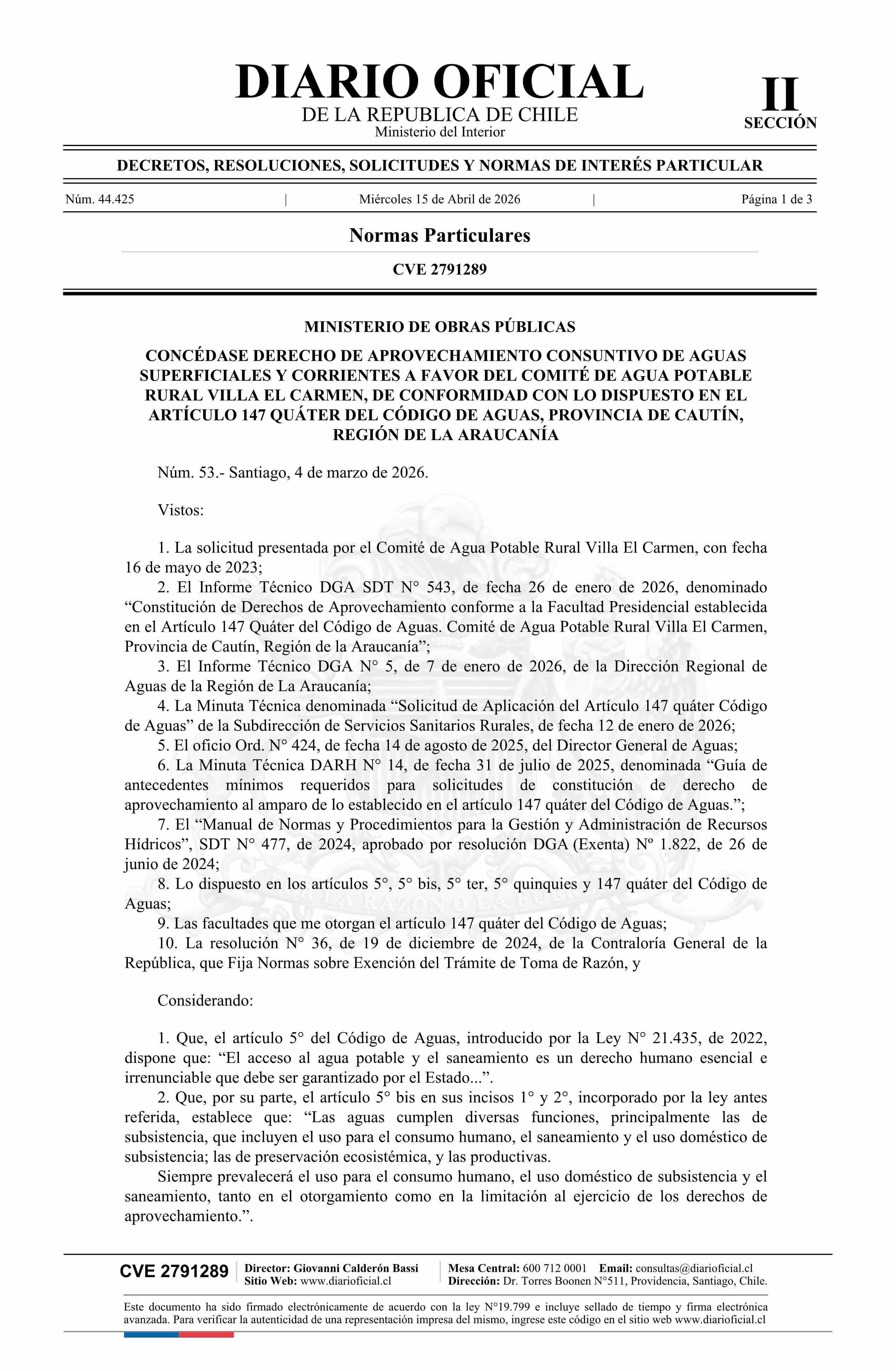 Decreto número 53, de 2026.- Concede derecho de aprovechamiento consuntivo de aguas superficiales y corrientes a favor del Comité de Agua Potable Rural Villa El Carmen, de conformidad con lo dispuesto en el artículo 147 quater del Código de Aguas, Provincia de Cautín, Región de La Araucanía