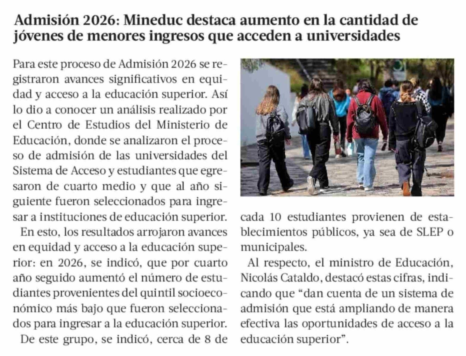 | Título: | Admisión 2026: Mineduc destaca aumento en la cantidad de jóvenes de menores ingresos que acceden a universidades |