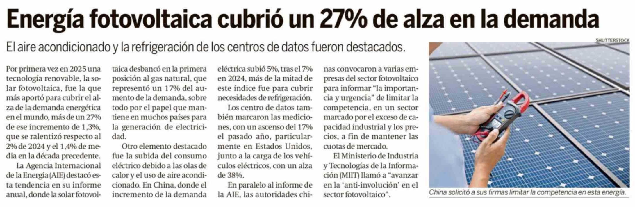 Título: Energía fotovoltaica cubrió un 27% de alza en la demanda