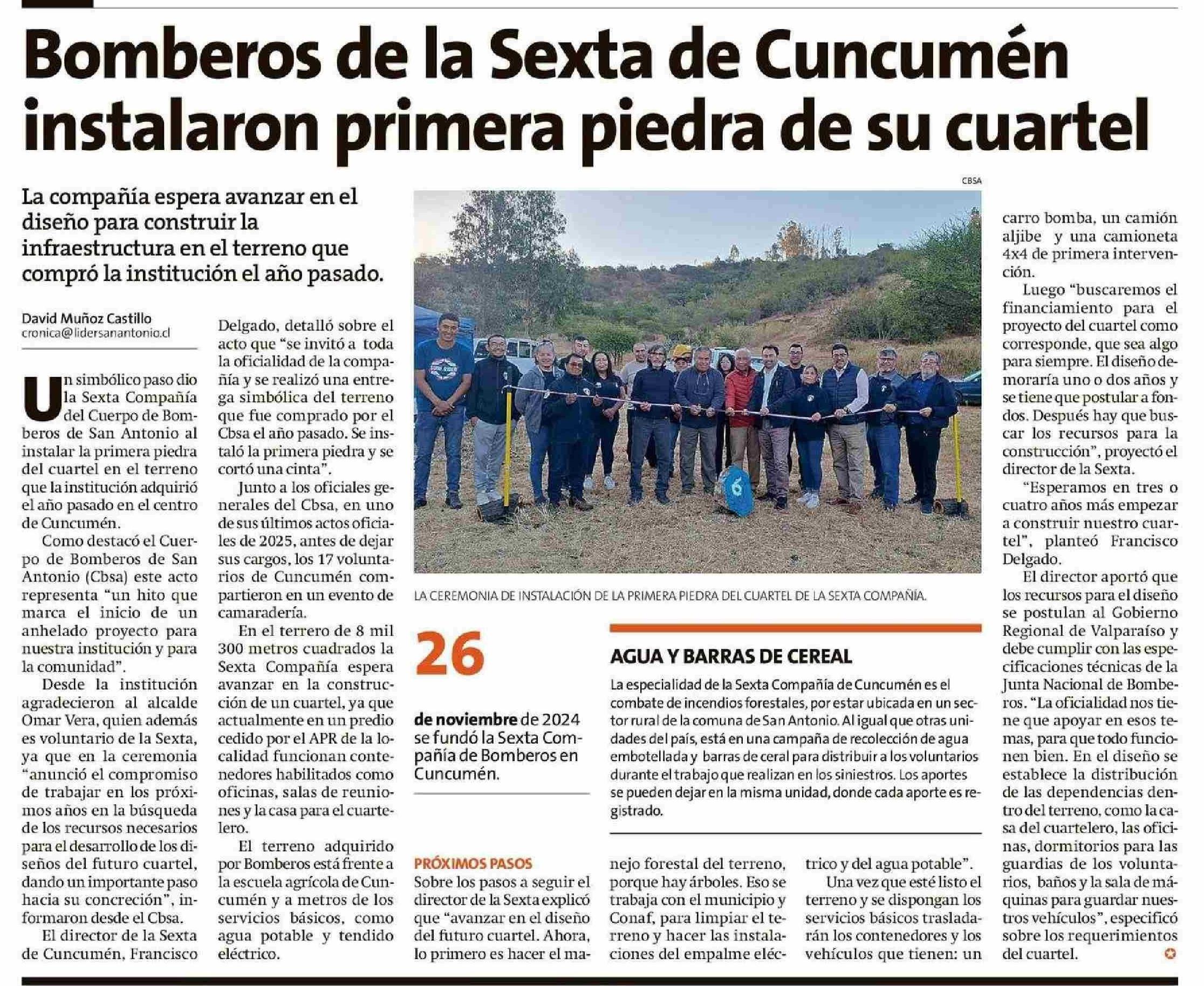 Bomberos de la Sexta de Cuncumén instalaron primera piedra de su cuartel 05-01-2026 El Líder |