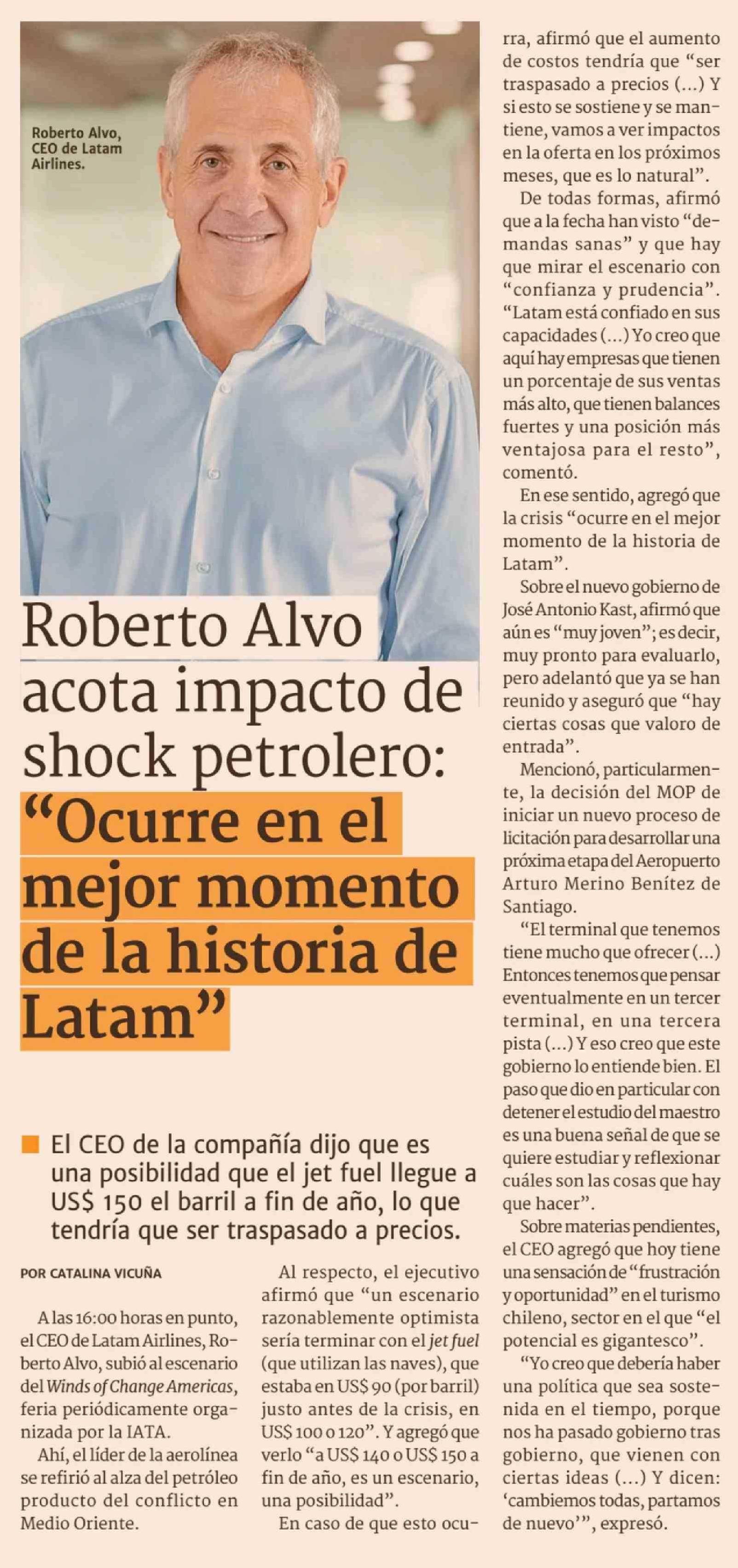 Roberto Alvo acota impacto de shock petrolero: "Ocurre en el mejor momento de la historia de Latam" 09-04-2026 Diario Financiero |