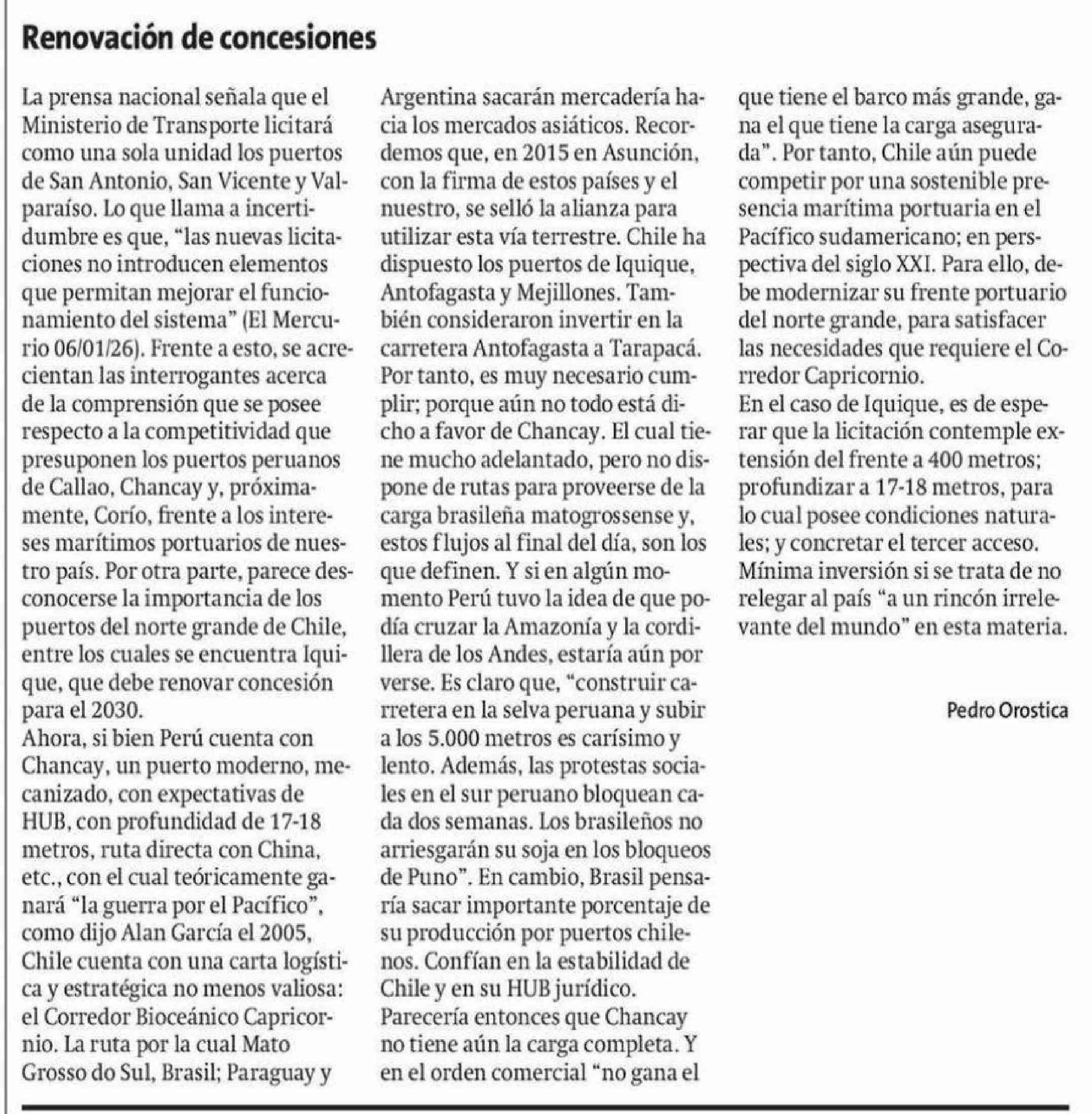 Columnas de Opinión: Renovación de concesiones 09-01-2026 La Estrella de Iquique |