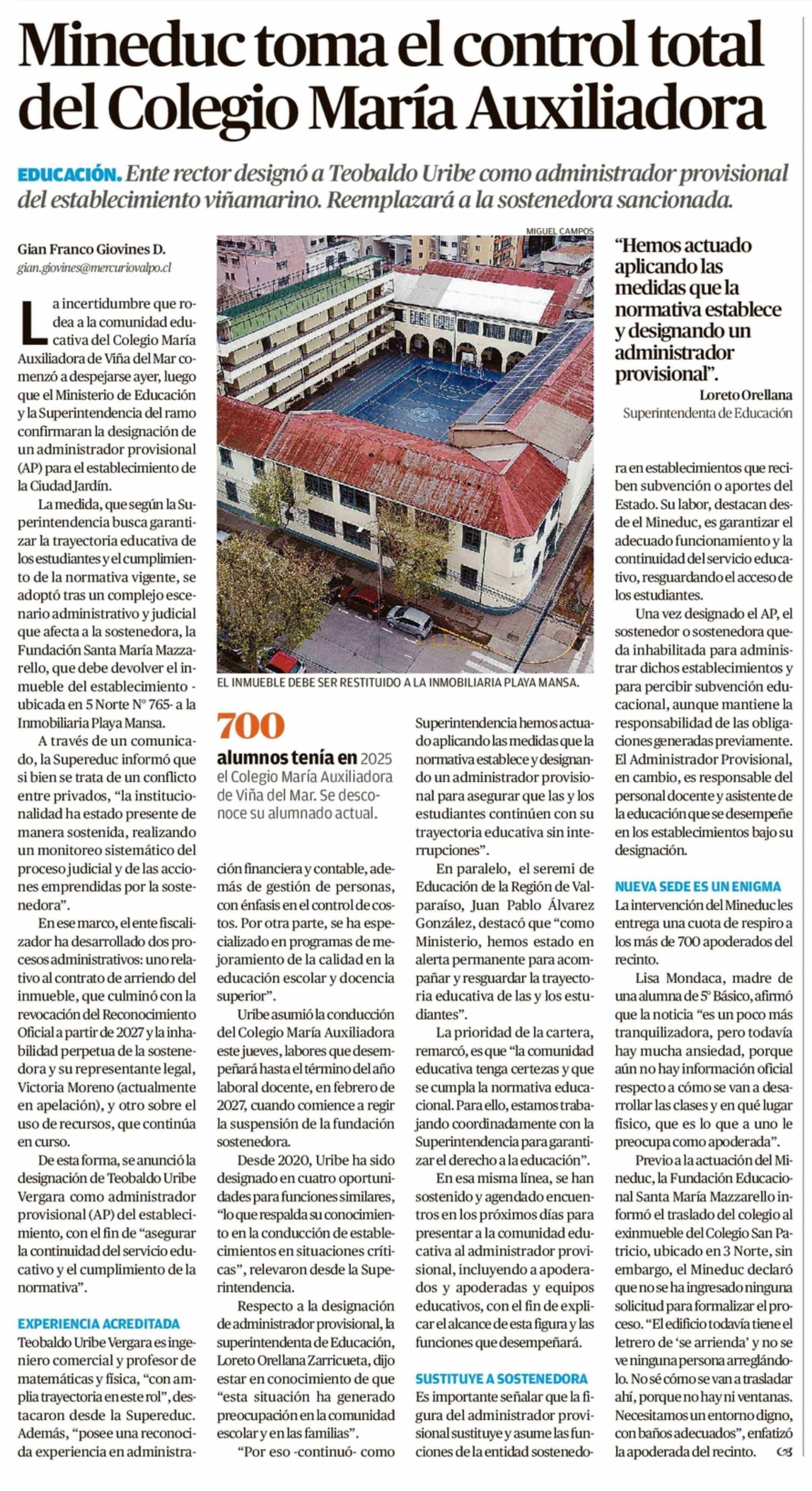 Mineduc toma el control total del Colegio María Auxiliadora 06-02-2026 El Mercurio de Valparaíso |
